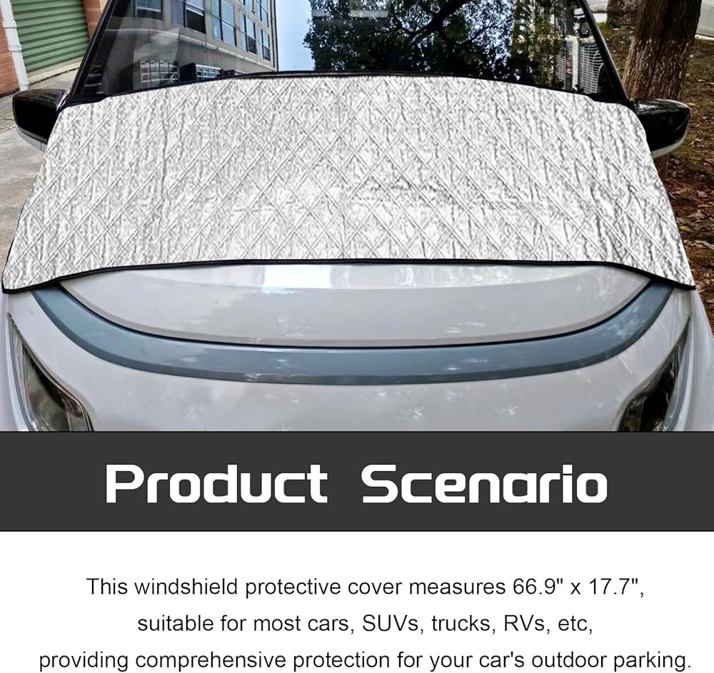 • 【Universal Dimensions】This windshield protective cover measures 66.9" x 17.7", suitable for most cars, SUVs, trucks, RVs, etc, providing comprehensive protection for your car's outdoor parking. Protects and covers the essential viewing area of the front windscreen.