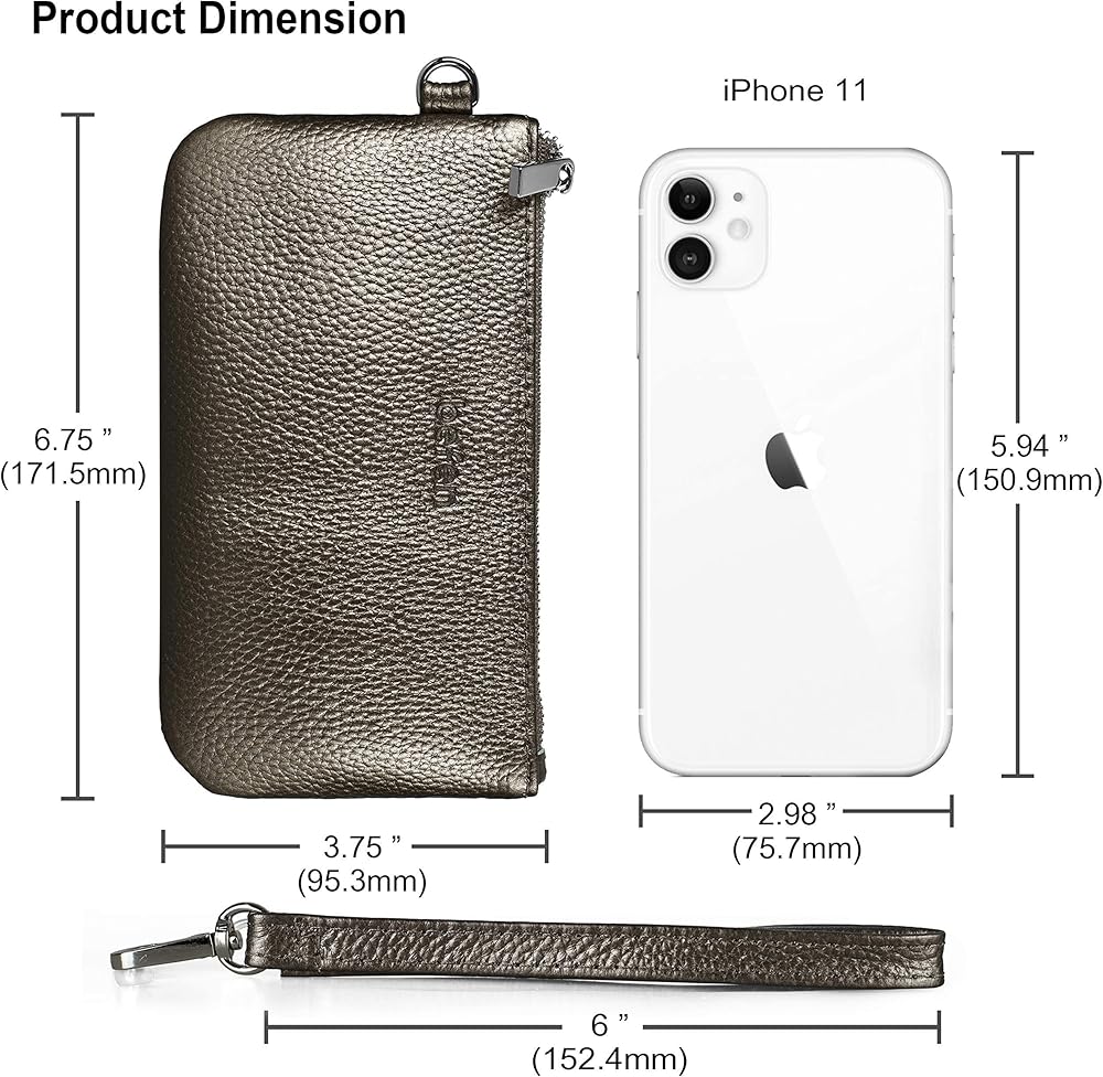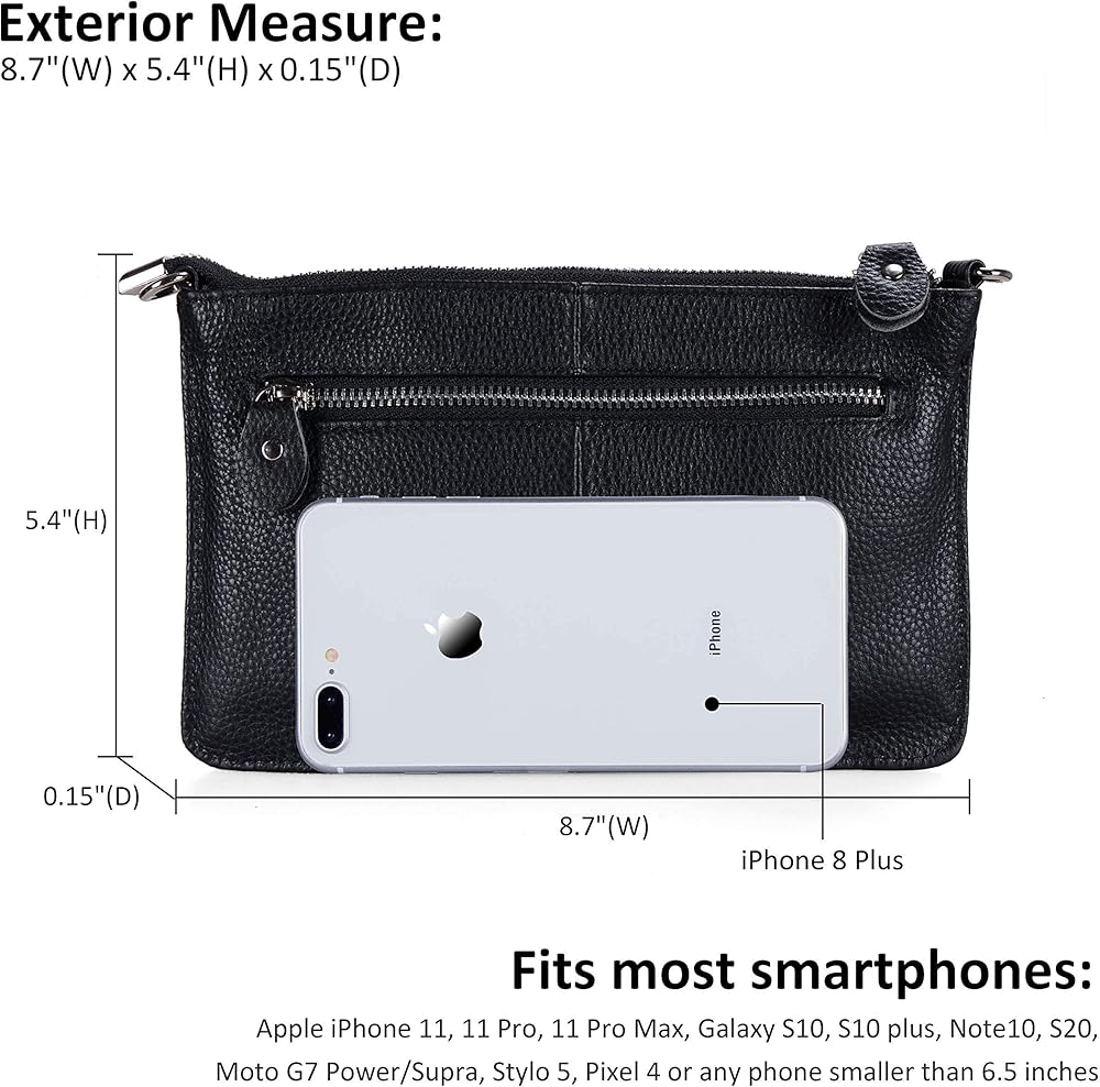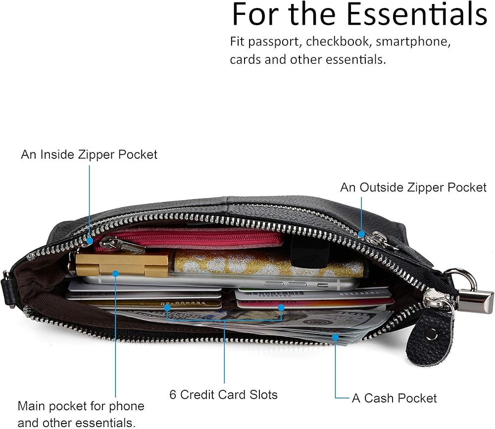 حقيبة يد صغيرة للمعصم: الهيكل: من الداخل: شقة واحدة بها جيب للنقود، و6 فتحات للبطاقات، وجيب داخلي بسحاب للعملات المعدنية. من الخارج: جيب واحد بسحاب من الخلف. البطاقات المناسبة ودفتر الشيكات وجواز السفر والهاتف المحمول وبعض الضروريات. 2 حزام: 1 حزام معصم قابل للإزالة 7.5 بوصة، 1 حزام كتف قابل للإزالة قابل للتعديل من 30 إلى 55 بوصة. القياسات الخارجية: 8.7 بوصة (عرض) × 5.4 بوصة (ارتفاع) × 0.5 بوصة (عمق). يمكن استخدامها كسوار معصم أو محفظة في حقيبة كبيرة أو حقيبة صغيرة تمر بالجسم.