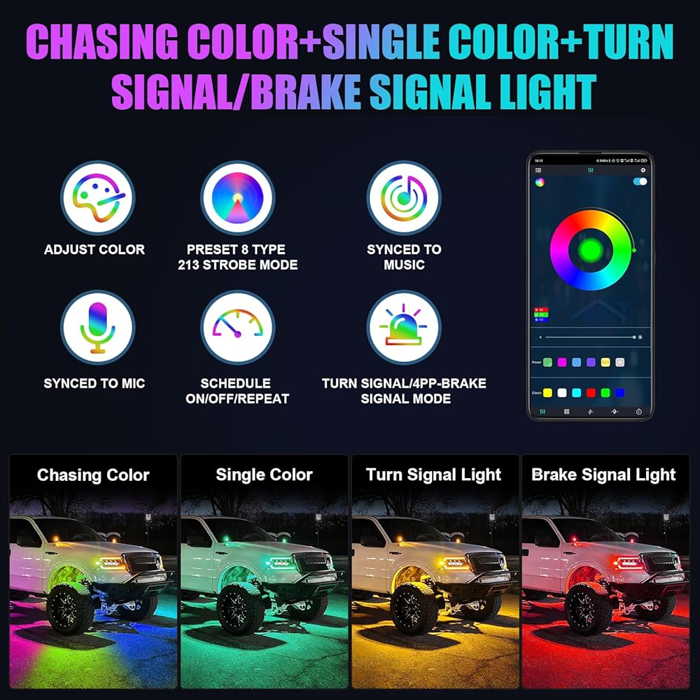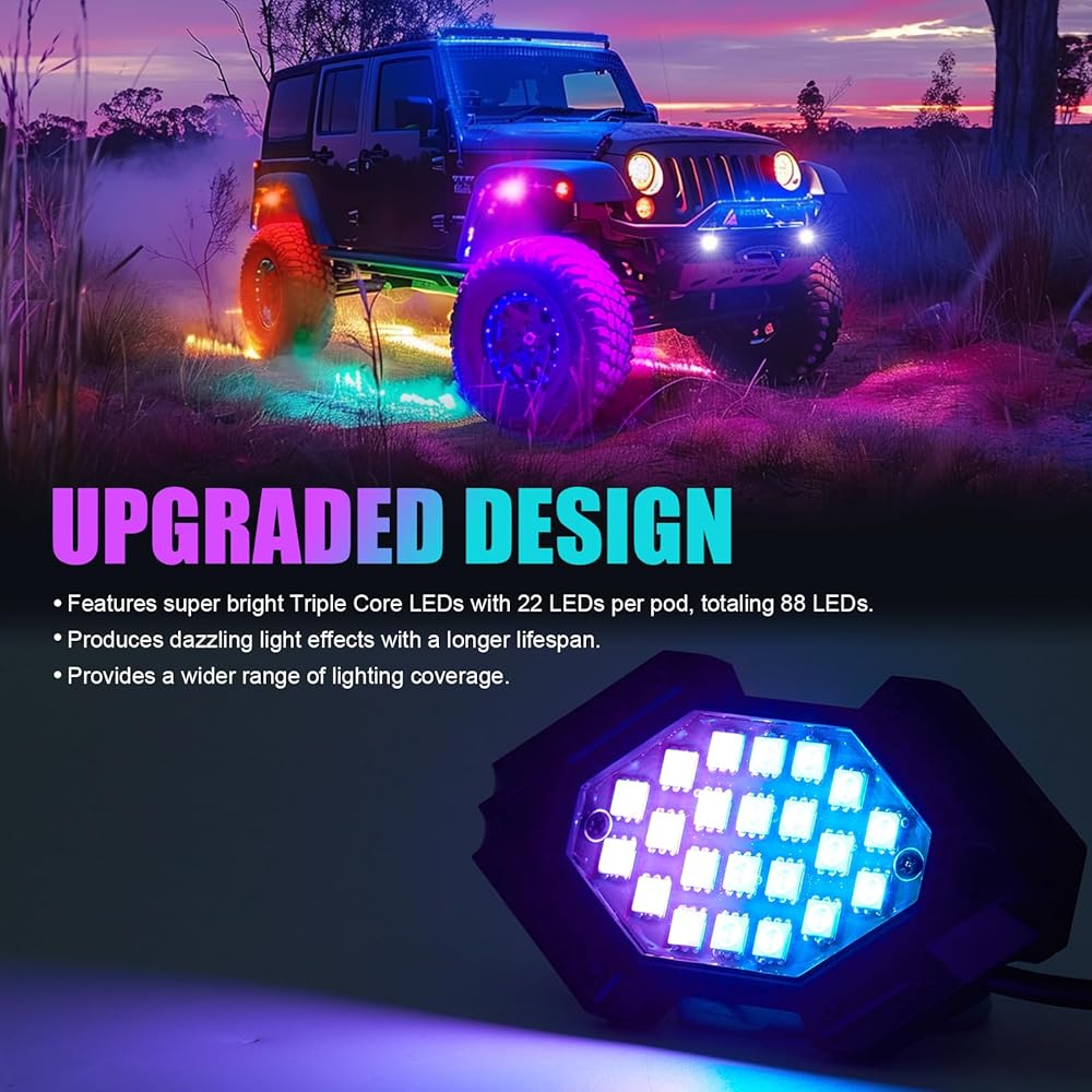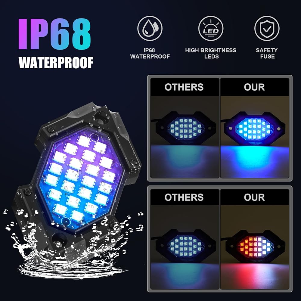 أضواء الصخور LED - التحكم في RGB عبر التطبيق، مقاومة للماء IP68، وظيفة الضوء/الفرامل 12 فولت، أضواء تحت الوهج للسيارة، الجيب، الشاحنة، UTV، ATV، عربة الجولف، الطرق الوعرة - 8 كبسولات