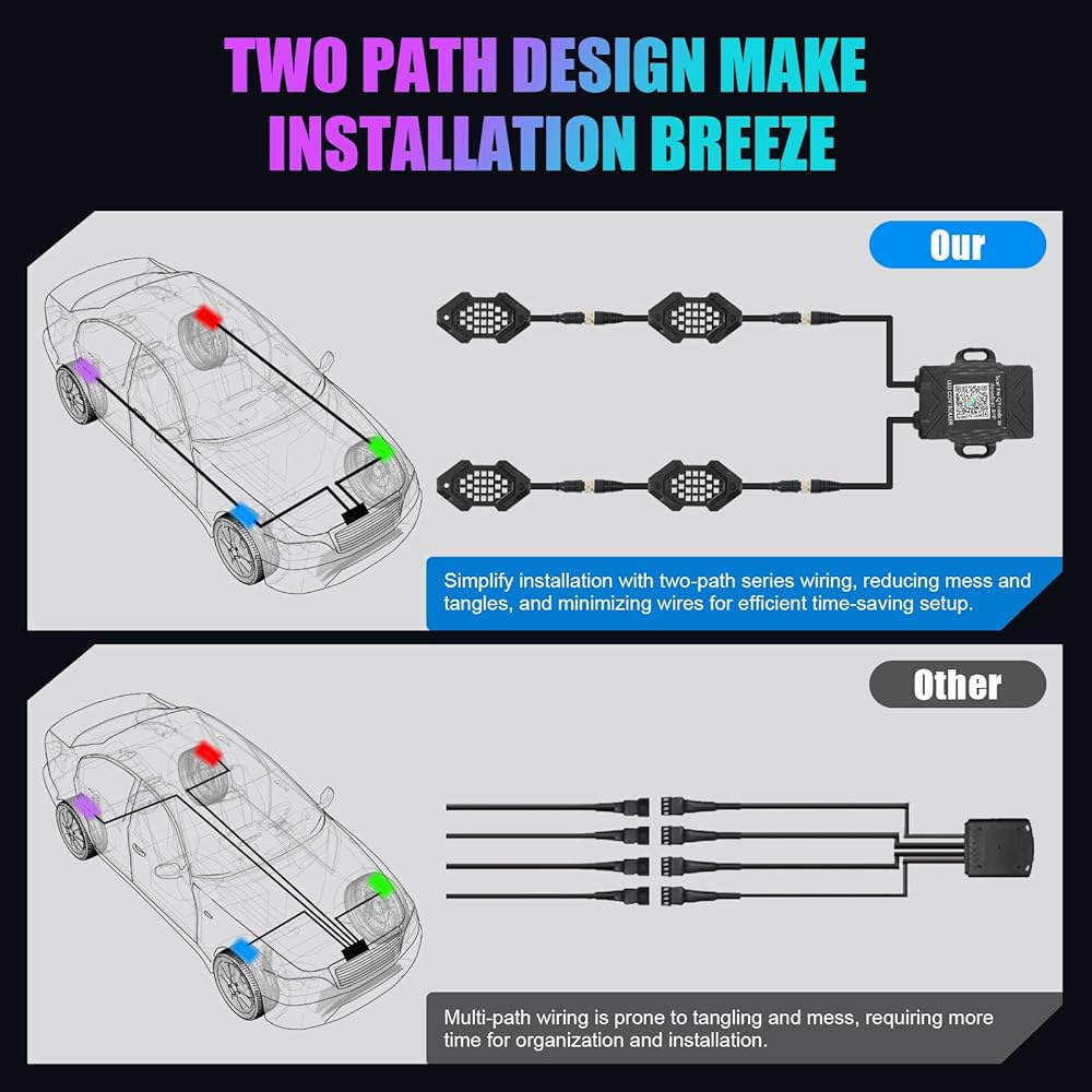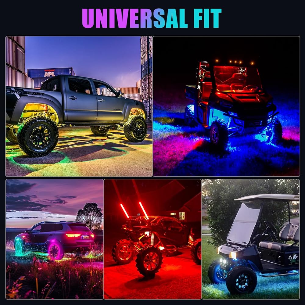 【تحكم مريح في التطبيق】: تطبيقنا متوافق مع كل من أجهزة Android وiPhone، مما يسمح لك بتخصيص شاحنتك تحت الأضواء المتوهجة مع 16 مليون لون RGB، و213 وضعًا ديناميكيًا، وسرعة قابلة للتعديل، وسطوع، وتأثيرات التنفس الوامضة، ومزامنة الموسيقى. مع هذه الأضواء الصخرية، ستجذب شاحنتك أو ATV أو SUV الانتباه بلا شك.