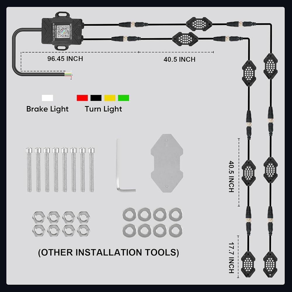 【ميزات فريدة من نوعها】: تشتمل أغطية الإضاءة الصخرية للشاحنة المطورة على أوضاع إضاءة الانعطاف وإضاءة الفرامل، مما يضيف خيارات إضاءة فريدة غير موجودة في المنتجات الأخرى. تعمل هذه الأوضاع على إنشاء تأثير إضاءة تدريجي من الجزء الخلفي إلى الجزء الأمامي من سيارتك، مع إعدادات سرعة قابلة للتعديل للحصول على تأثير بصري مذهل. يمكنك التحكم في مصابيح الصخور LED هذه عبر التطبيق للحصول على تجربة مخصصة تحت التوهج.