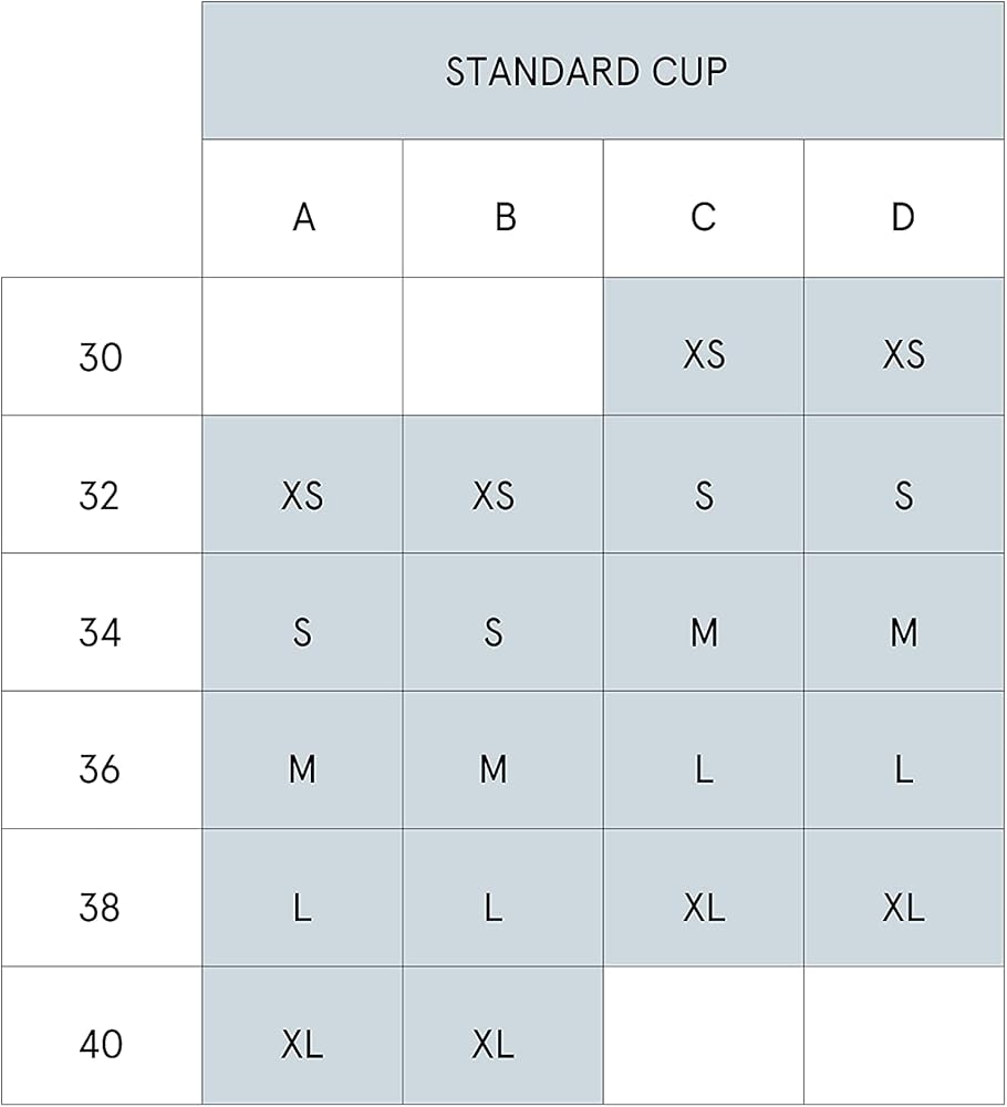 • A-D cup XS مقترح لمقاسات حمالات الصدر 30C-D و32A-B S مقترح لمقاسات حمالات الصدر 32C-D و34A-B M مقترح لمقاسات حمالات الصدر 34C-D و36A-B L مقترح لمقاسات حمالات الصدر 36C-D و38A-B XL مقترح لمقاسات حمالات الصدر 34C-D و36A-B مقترح لـ مقاسات حمالة الصدر 38C-D و40A-B