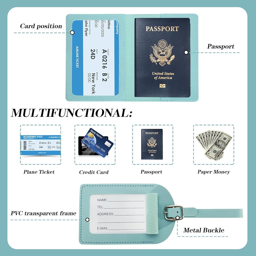 【Quality Material】The passport holder and luggage tag set are made of synthetic leather with a comfortable, soft texture. Keep your important travel documents in your luggage or bag and the passport holder will protect your passport from damage, bending or defacement. Luggage tags have strong metal buckles that securely attach the tag to your luggage.