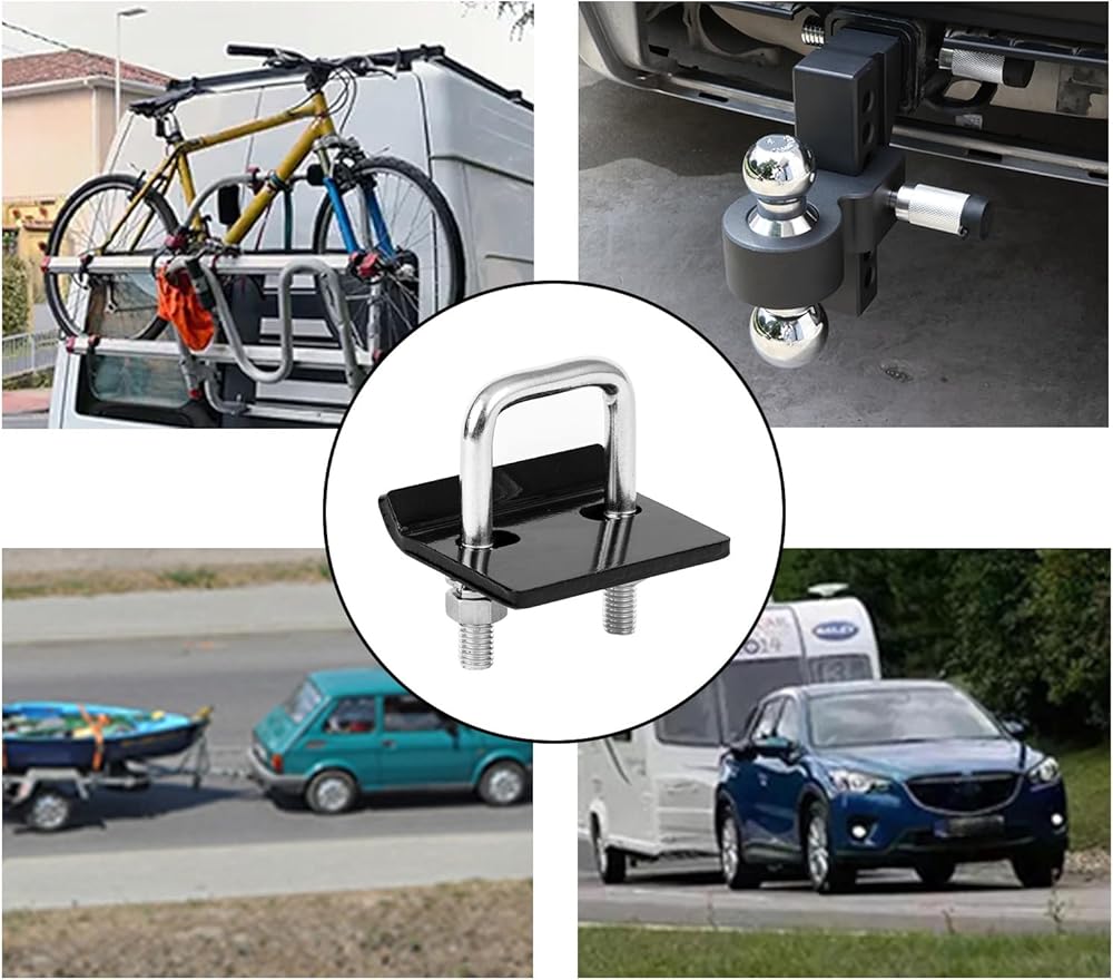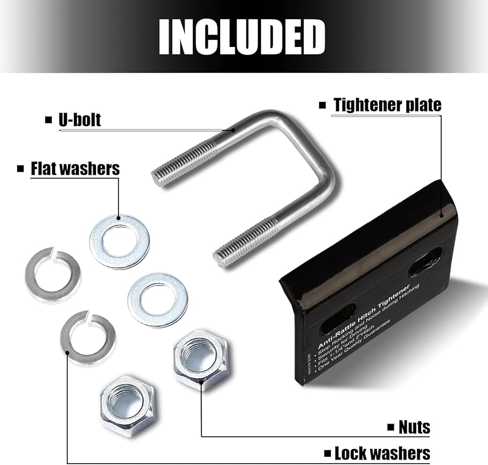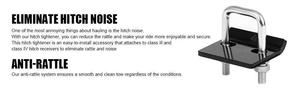 This tow clamp is perfect for locking 1. 25" and 2" hitches, compatible with most hitches classes I, II, III, and IV (1, 2, 3 and 4). Suitable for trailer truck SUV sedan RV camper van and minivan. Reduce rattle and movement for hitch tray, cargo carrier, bike rack, trailer ball mount with brands curt,highland, goplus, pro series, rola, yakima, thule, etc. High-Strength Anti-Rust U-Bolt with Rubber Isolator and Tightener Plate, 1 Rubber Isolator, 2 Spring Lock Washers, 2 Flat Washers, 4 Locking Nuts, All the Parts of Surface was Covered By Galvanize & Powder CoatedCan help to decrease noise and give you a quiet world when towing. Easy to install, after insert the tube, lock them directly by U-bolt and plate, put on original spring washers, flat washers and fasten by nuts, then done. Follow the picture to install it and also can be mounted from the bottom. If the hitch is low, and there is a risk for U-Bolt to scrap ground, lock the tightener from the bottom. Use on ball mounts, drop hitches, hitch adapters, hitch extenders and other trailer accessories. Spring lock washers and flat washers help to tightening it in place and secure.