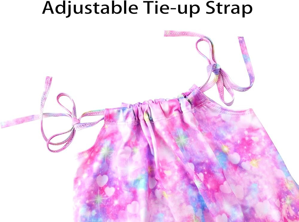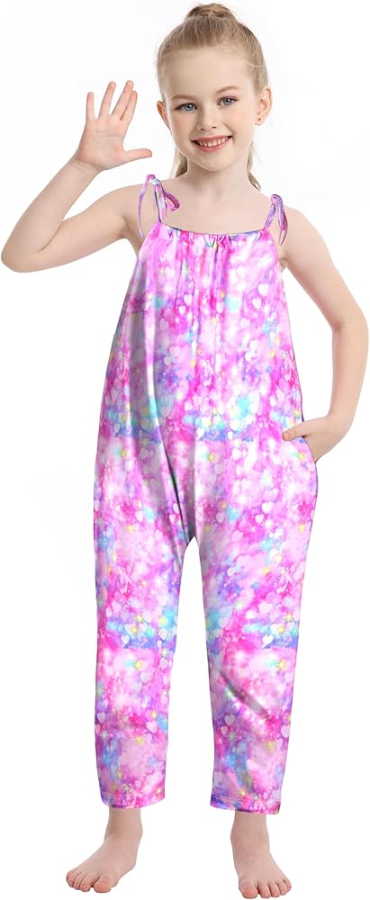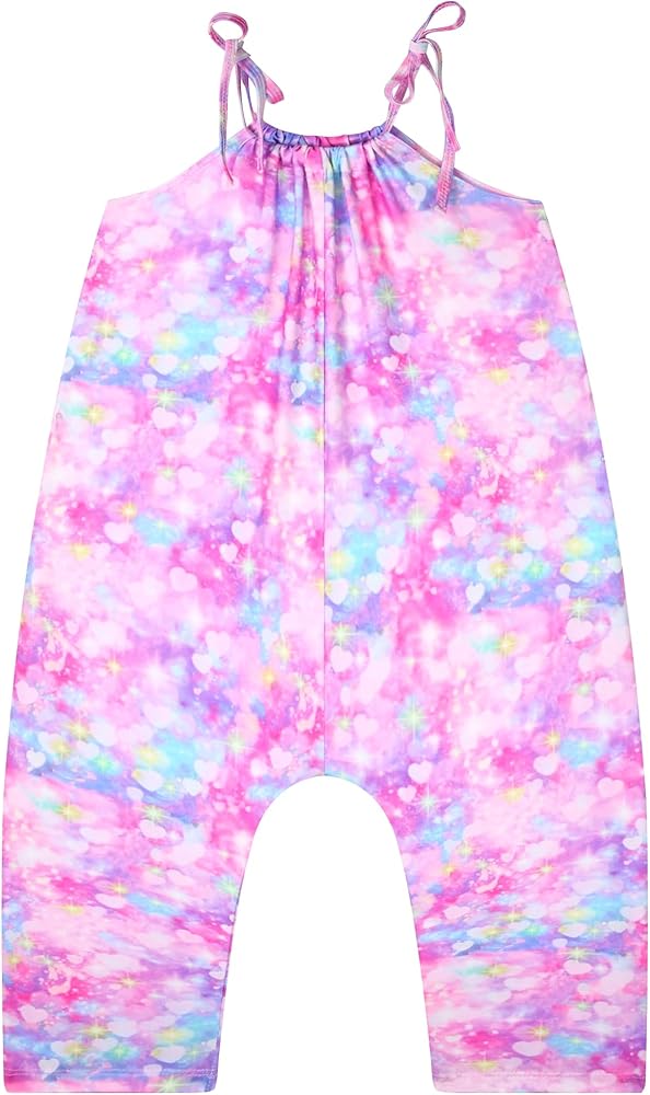 Girls' jumpsuits, polyester fabric, comfortable and breathable, soft fabric to protect the baby's delicate skin, with good elasticity, for children's free running to provide comfortable wearing experience. The girl's backless rompers has a unique design, adjustable strap for children to adjust the tightness, strap design to make children cute and stylish, 2 side pockets to provide convenience, easy storage. The adjustable strap girls' jumpsuits has classic colorful prints, donuts, rainbow leopard print, beauty fish scales, neon hearts, etc., so that children can release their nature and feel the changing style.