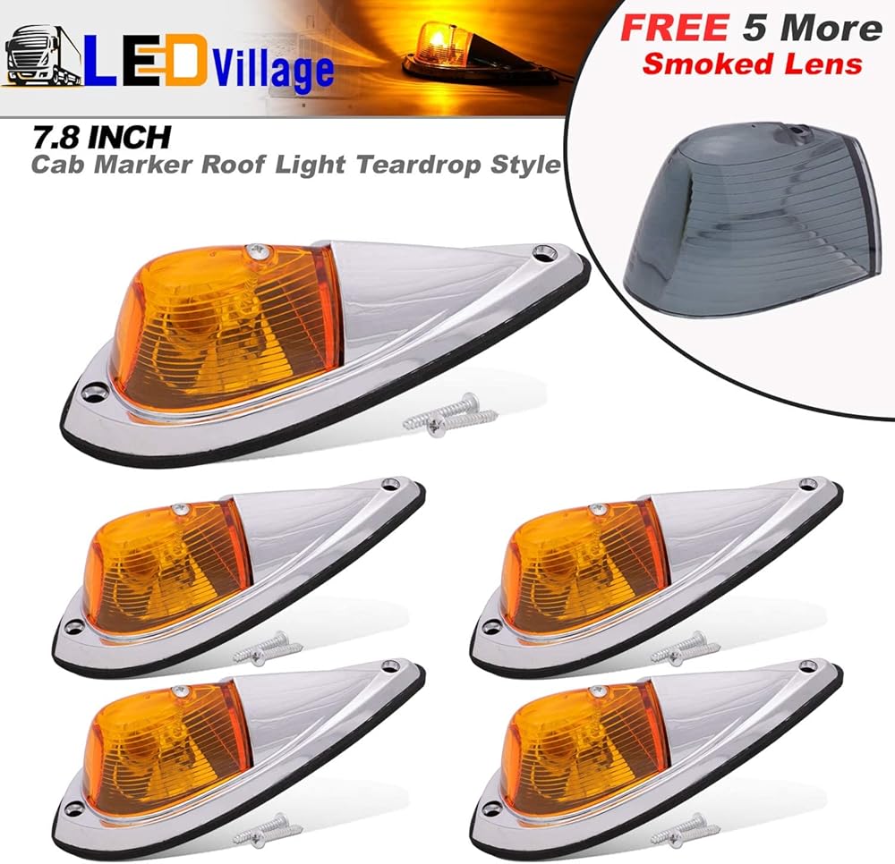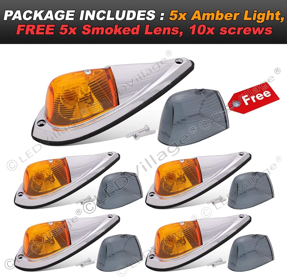 العبوة: 5 قطع من الضوء الكهرماني و5 قطع من مجموعة إزالة السقف لغطاء العدسات المدخنة لشاحنات الالتقاط RV. عدسة بولي كربونات مع براغي، غطاء عالي التأثير من فئة السيارات مطلي بالكروم.