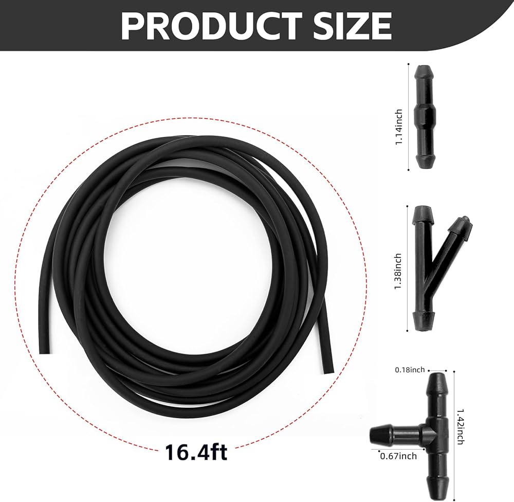 • 【Product Parameters】The length of the windshield washer hose is 16.4Ft, which is sufficient length to adapt to more usage needs. The package includes 10 x I 2-way hose connectors, 10 x Y 3-way hose connectors, 10 x T 3-way hose connectors. Sufficient quantity to meet your use and replacement needs.