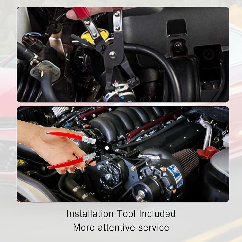 2 radiator hoses, 1 hose clamp pliers, 1 pair of safety work gloves, 1 coolant outlet (including temperature sensor, screws, and washers), fully equipped for easy installation