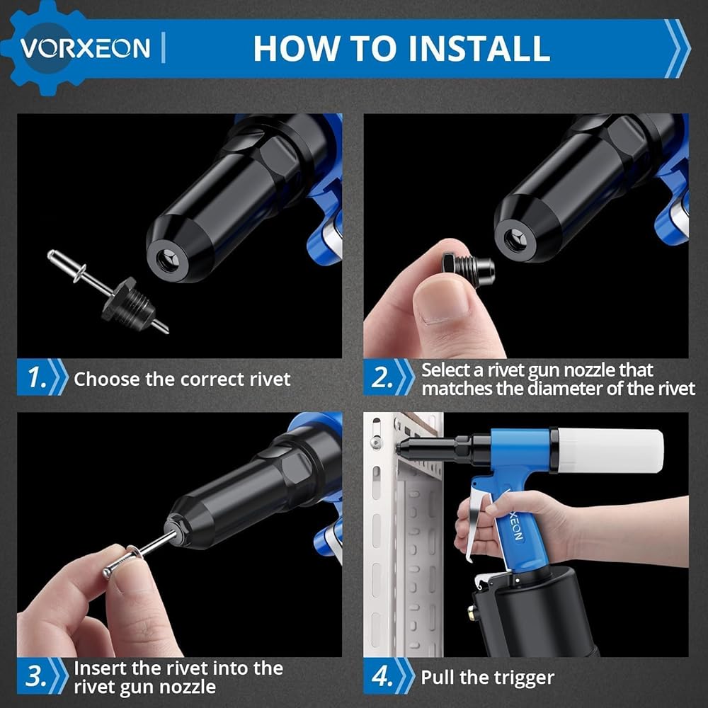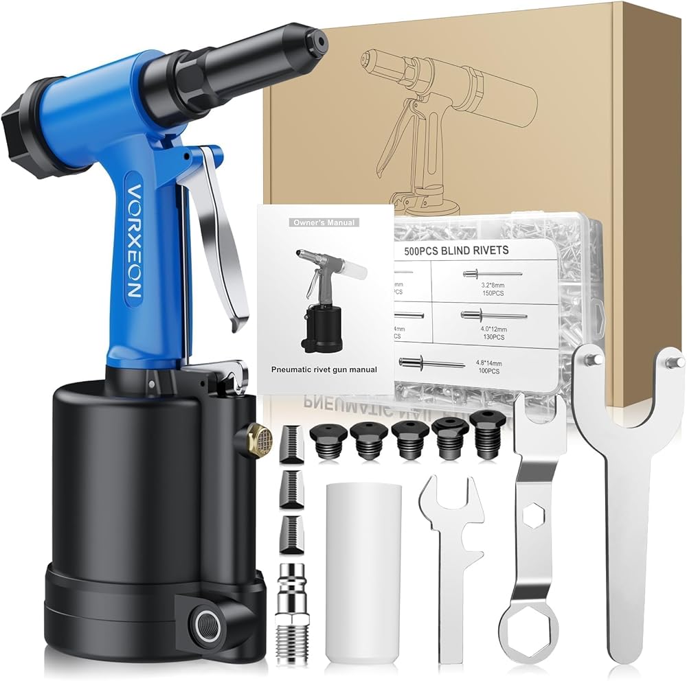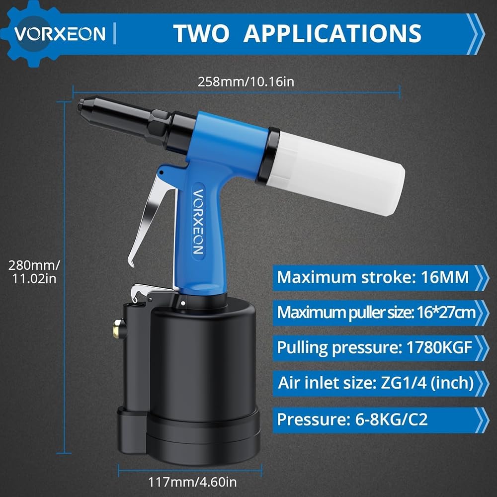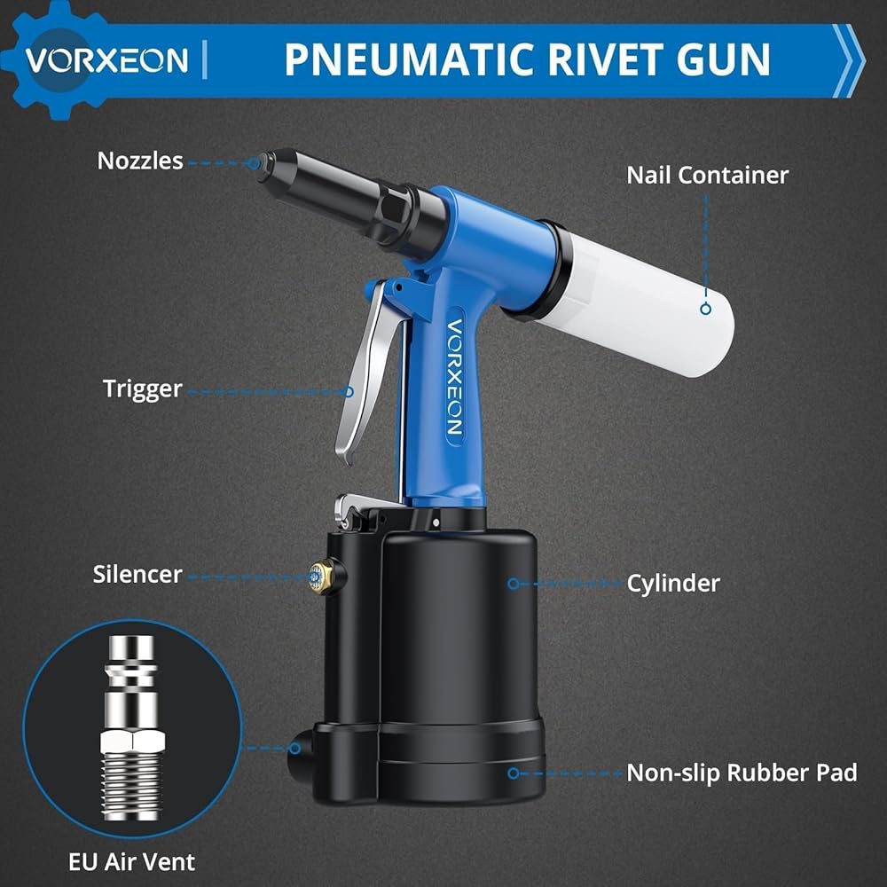 مسدس برشام هوائي احترافي من VORXEON: مناسب لمواد مختلفة من المسامير، بما في ذلك الألومنيوم والفولاذ والحديد. تشتمل مجموعة مسدس الهواء على 5 رؤوس برشام بأحجام مختلفة، 2 مفتاح ربط، 1 مفتاح ربط أساسي، 3 فكوك بديلة، 1 فوهة هواء بمواصفات الولايات المتحدة (NPT 1/4 بوصة)، وزجاجة تجميع قابلة للإزالة. يساعدك على إكمال مجموعة واسعة من مهام الإصلاح والتركيب بكفاءة