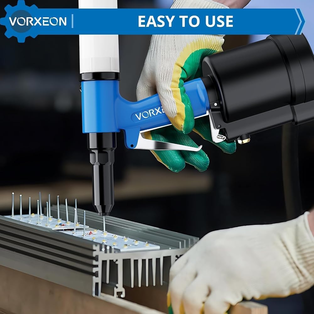 كفاءة أعلى: مع تصميم محرك هيدروليكي هوائي وضغط سحب قوي يبلغ 3916 رطلاً (1780 كجم)، يوفر مسدس التثبيت الهوائي هذا كفاءة لا مثيل لها. باستخدام هذه الأداة، يتم إكمال المهام بسرعة، مما يوفر الوقت والطاقة الثمينين. يتم إنجاز تجميع البرشام في غضون ثوانٍ، مما يلغي الحاجة إلى العمل اليدوي ويبسط سير العمل