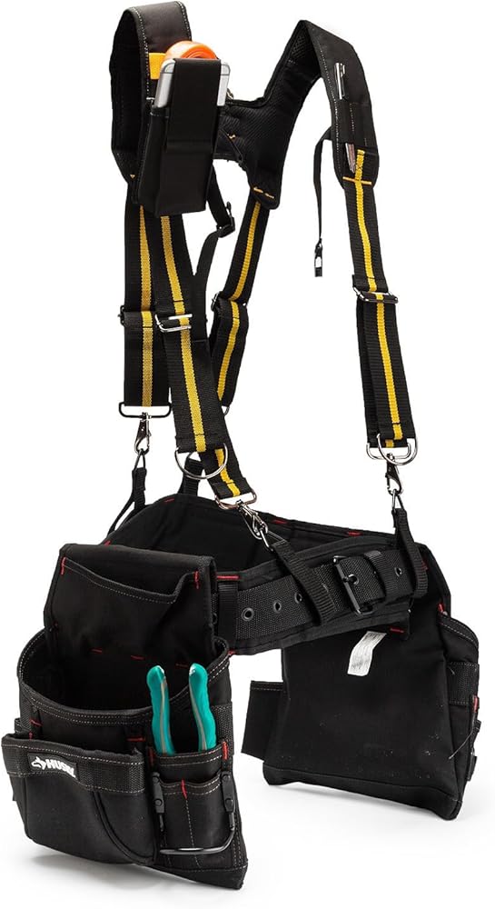 Handy Tool Pockets:Padded tool belt suspenders have pockets ,one movable phone holder and you can adjust it, one tape holder, one pencil sleeve can fit carpenter pen and knife.