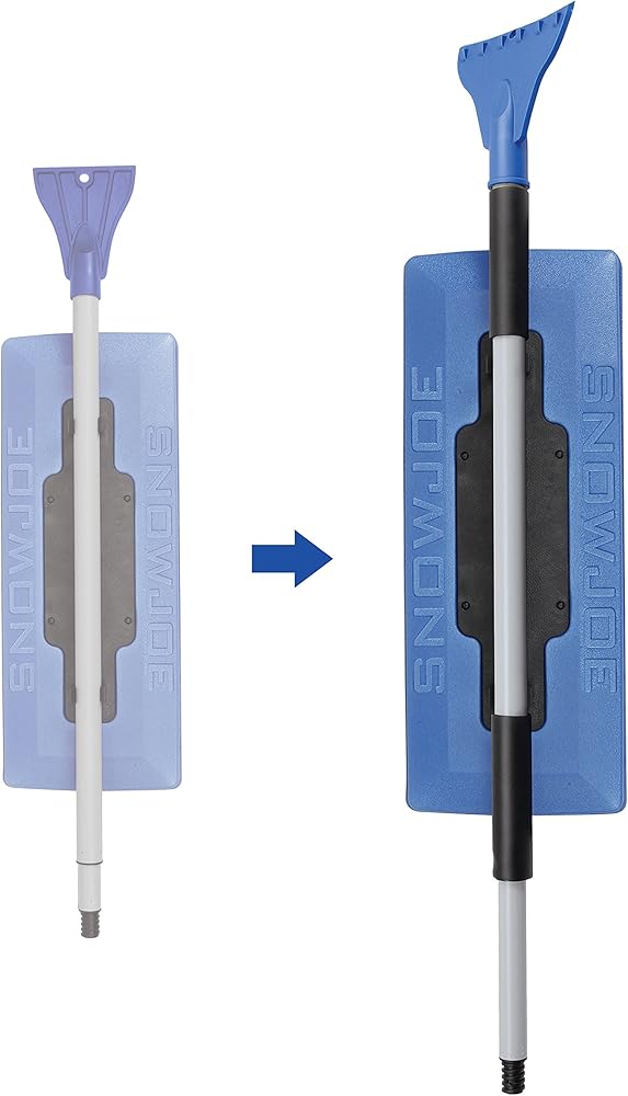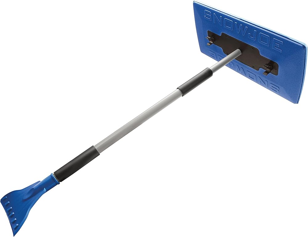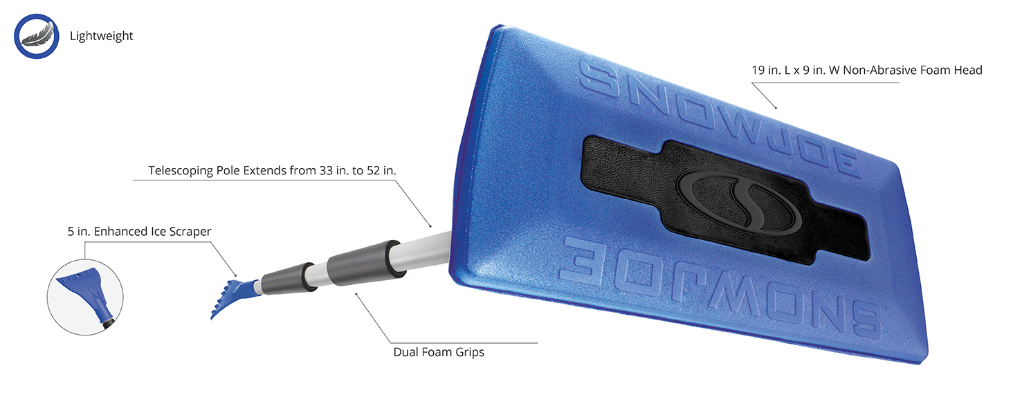 BIGGER IS BETTER! We took the best and made it bigger! The 2-in-1 telescoping Jumbo Snow Broom from Snow Joe makes quick work out of the snow piled on the roof, hood, trunk, or windshield of your car. Its patented dual-purpose design features an oversized broom head on one end and a built-in XL ice scraper on the other, so you can quickly push heavy, wet snow off your car, then clear away the ice build-up on your windshield with just one tool. Made with a durable, reinforced, non-abrasive foam head, the 19-inch Snow Broom safely and effectively sweeps snow off your car without scratching the glass surfaces. Plus, its telescoping pole extends from 33 to 52 inches to provide maximum reach with minimal strain. Weighing only 1.5 lbs, the Jumbo Snow Broom is super easy to handle and stores neatly inside the trunk of your car with its built-in bracket holder. GET EQUIPPED® this winter with our Snow Joe® 2-in-1 Telescoping Jumbo Snow Broom and clear out fast from tough winter messes.