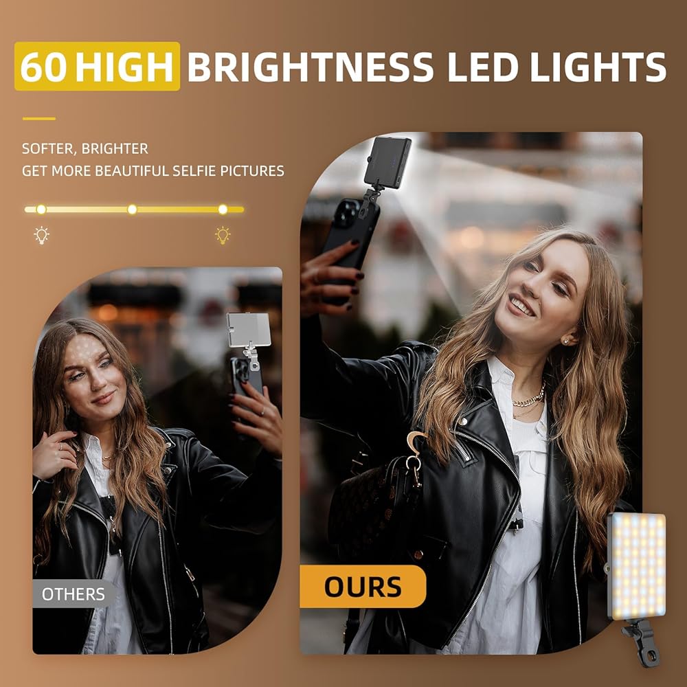 3 أوضاع إضاءة متاحة: يحتوي ضوء السيلفي الخاص بنا على ثلاثة أوضاع: الضوء البارد، والضوء الدافئ، والضوء الطبيعي. تساعد أوضاع الإضاءة المختلفة على التقاط الصور بألوان مختلفة، مما يلبي احتياجات صورك الشخصية المتنوعة. مع 10 مستويات من السطوع القابل للتعديل، توفر 60 خرزة LED عالية الجودة إضاءة ثابتة وخالية من الوميض لالتقاط صور السيلفي/الفيديو.