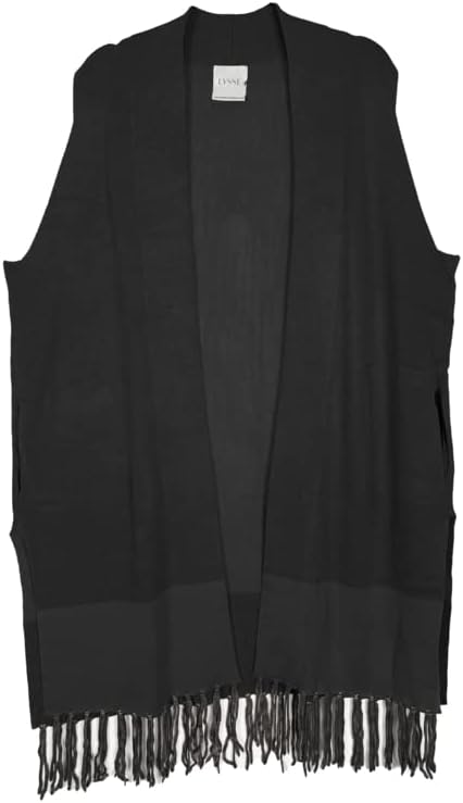 Cozy long open double knit vest with color blocked hem and fringe detail