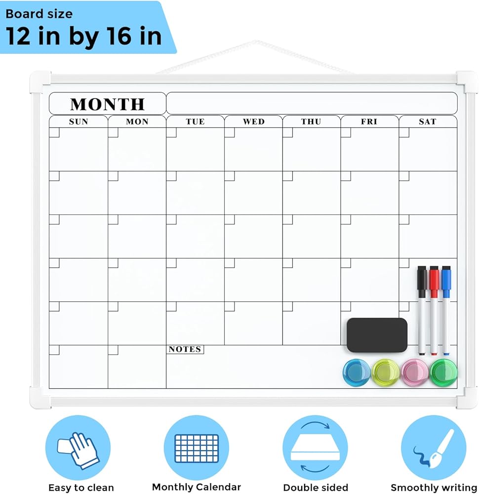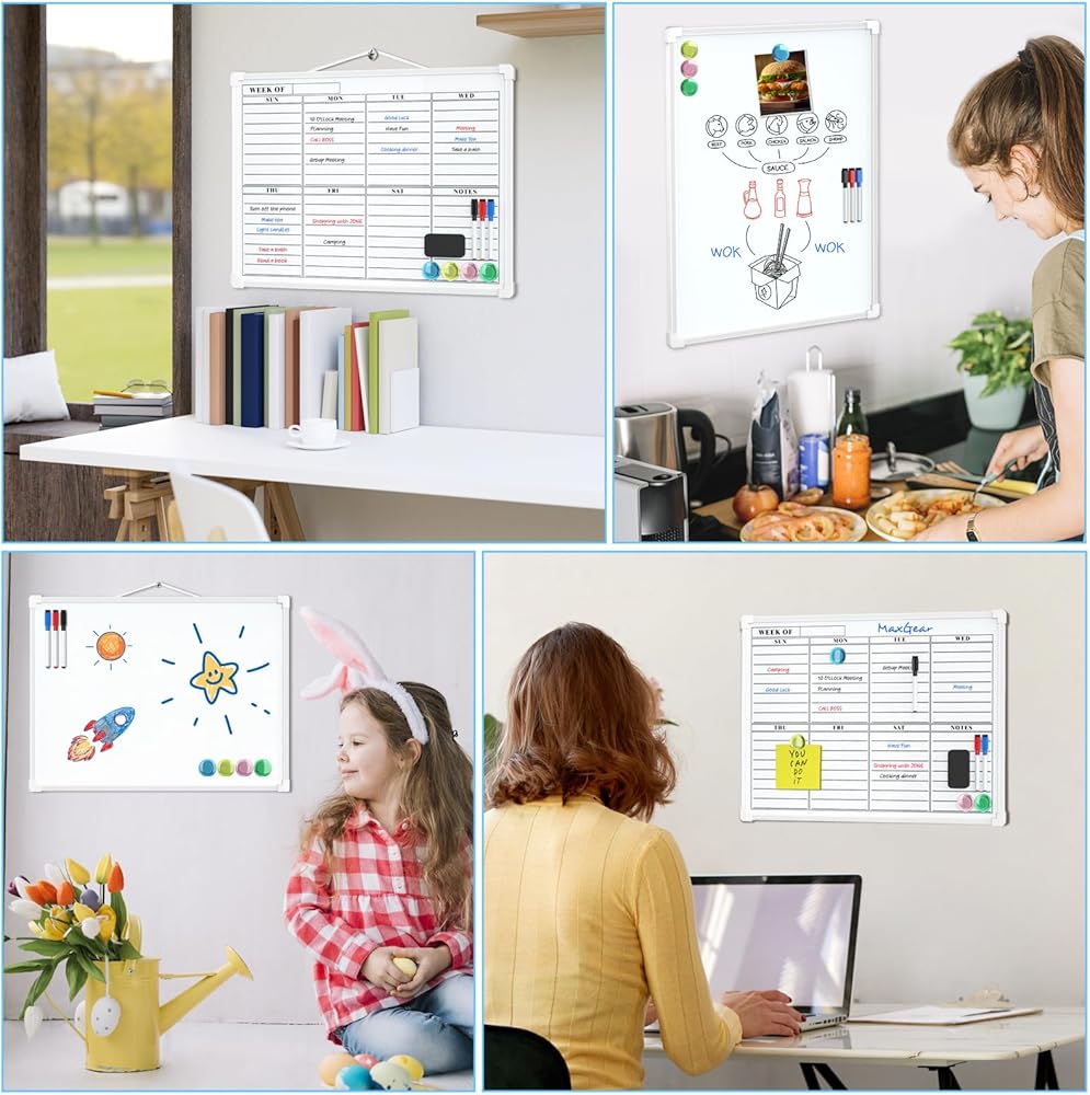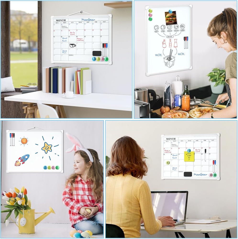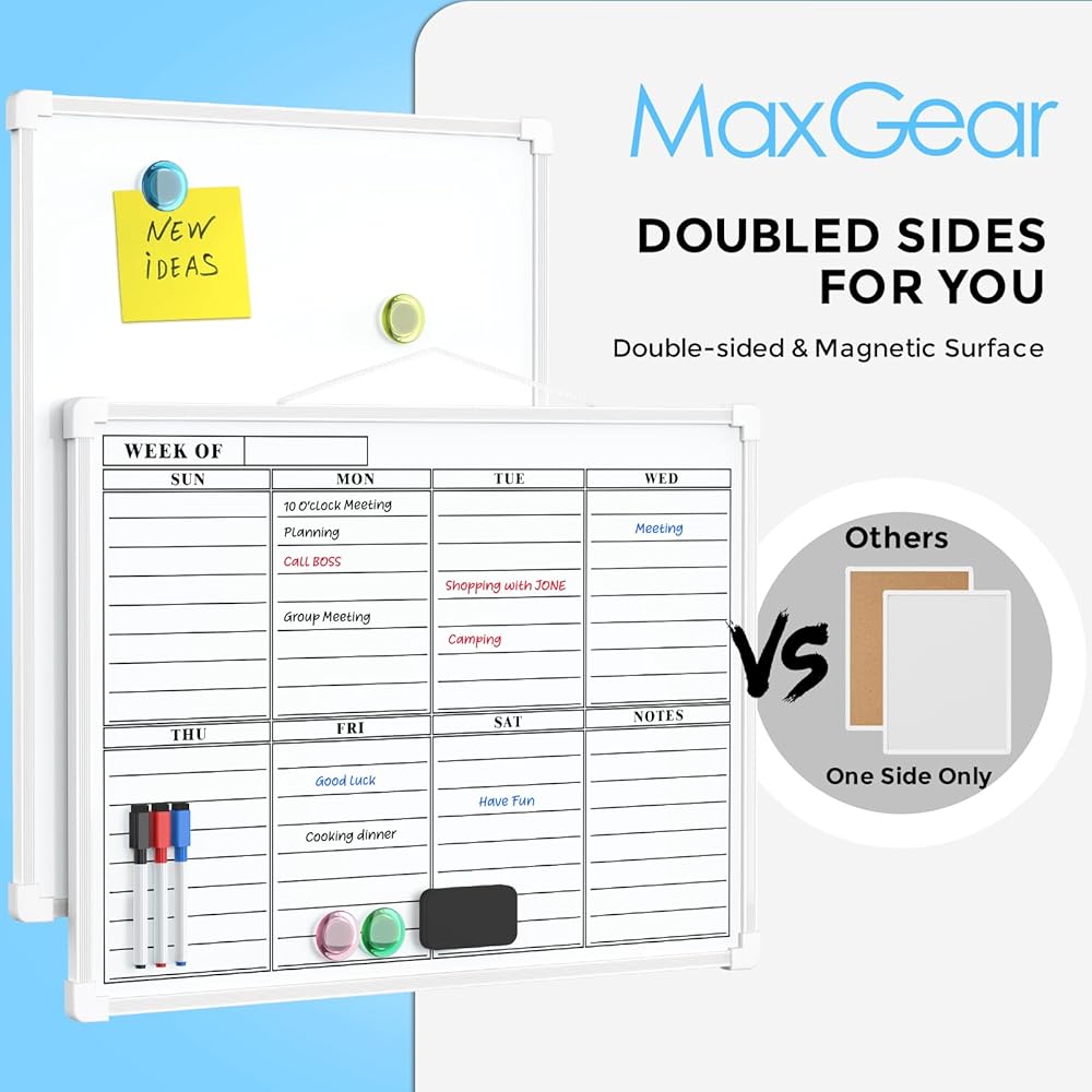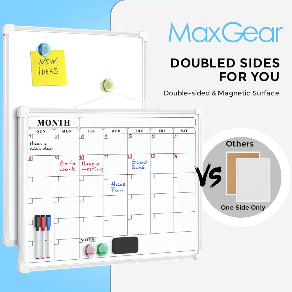 ممتاز ومتين: لوح المسح الجاف مزدوج الجوانب مقاس 16 بوصة × 12 بوصة من MaxGear مصنوع من مواد عالية الجودة، وهي متينة للغاية. تشتمل العبوة على لوحة مقاس 30.48 سم × 40.64 سم مع حبل على الجانب، و3 ألوان مختلفة من الأقلام مع غطاء مغناطيسي وممحاة مدمجة، و4 مغناطيسات، وممحاة جافة مغناطيسية، و4 قطع من شريط مزدوج الجوانب ومجموعتين من مسامير.
