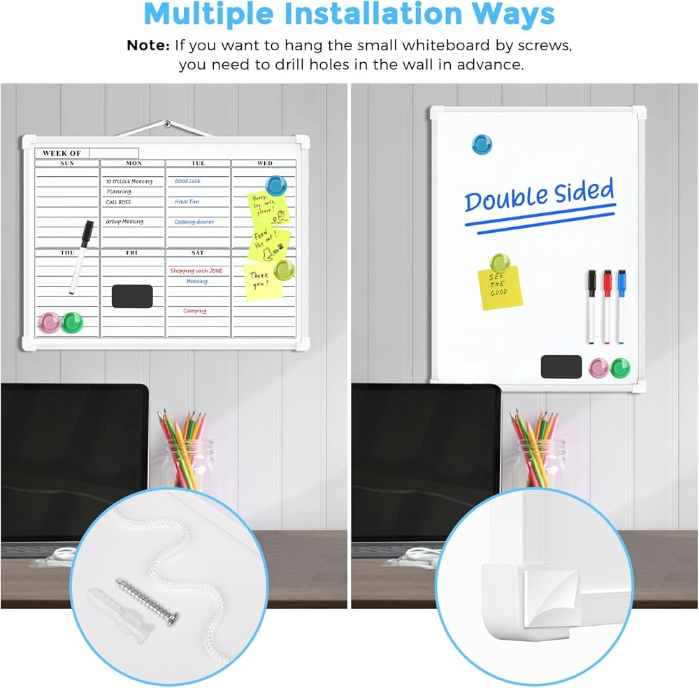 تصميم حبل للتعليق: من أجل راحة الاستخدام، تمت ترقية السبورة البيضاء الخاصة بنا. تمت إضافة حبل معلق إلى جانب السبورة البيضاء لدينا، والذي يمكن تعليقه مباشرة على الحائط أو الرف. كما يمكنك تثبيته بسهولة باستخدام الأشرطة ذات الوجهين، ولا حاجة إلى الحفر حتى على الأسطح النظيفة. تسمح لك طريقتا التثبيت بتعليقه أفقيًا أو رأسيًا كما تريد.