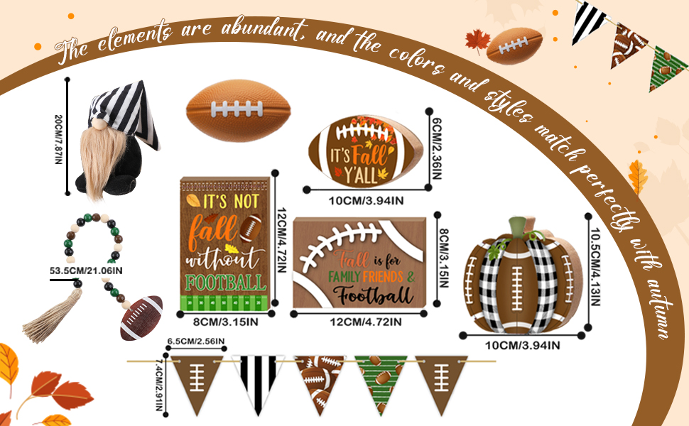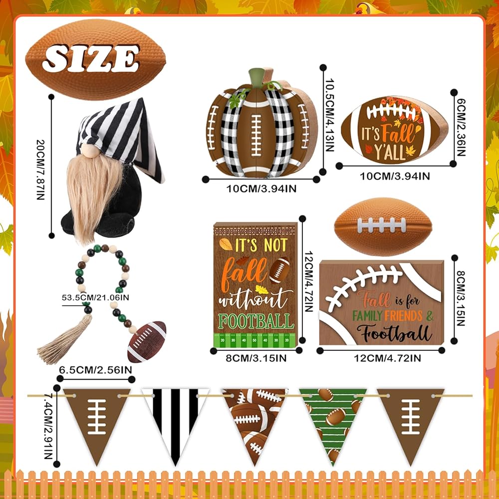 عزز ديكور الخريف الخاص بك: سوف تحصل على 15 قطعة من ديكورات الخريف لكرة القدم بأنماط مختلفة، مثل دمية جنوم مخططة باللونين الأسود والأبيض، و4 لافتات كرة قدم صغيرة، وإكليل من الخرز الخشبي الملون والمزيد، مما يوفر وفرة من الخيارات لخلق احتفالي الجو في منزلك