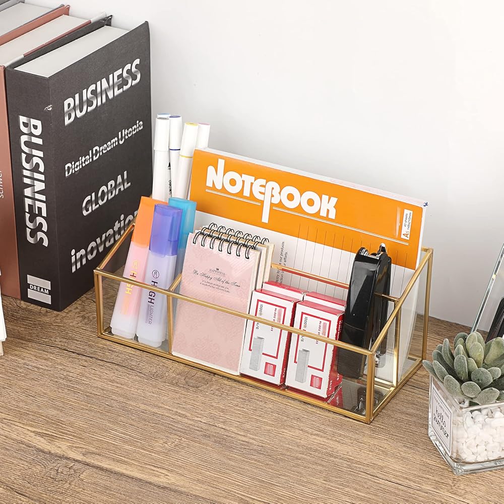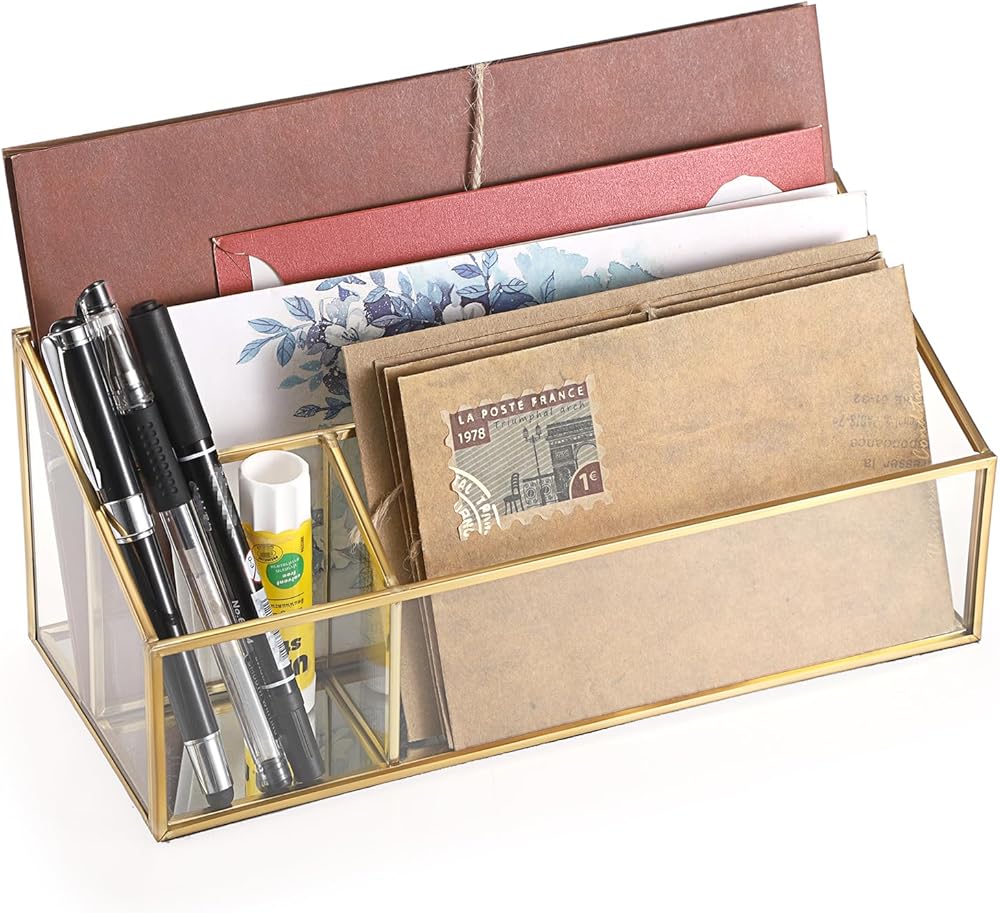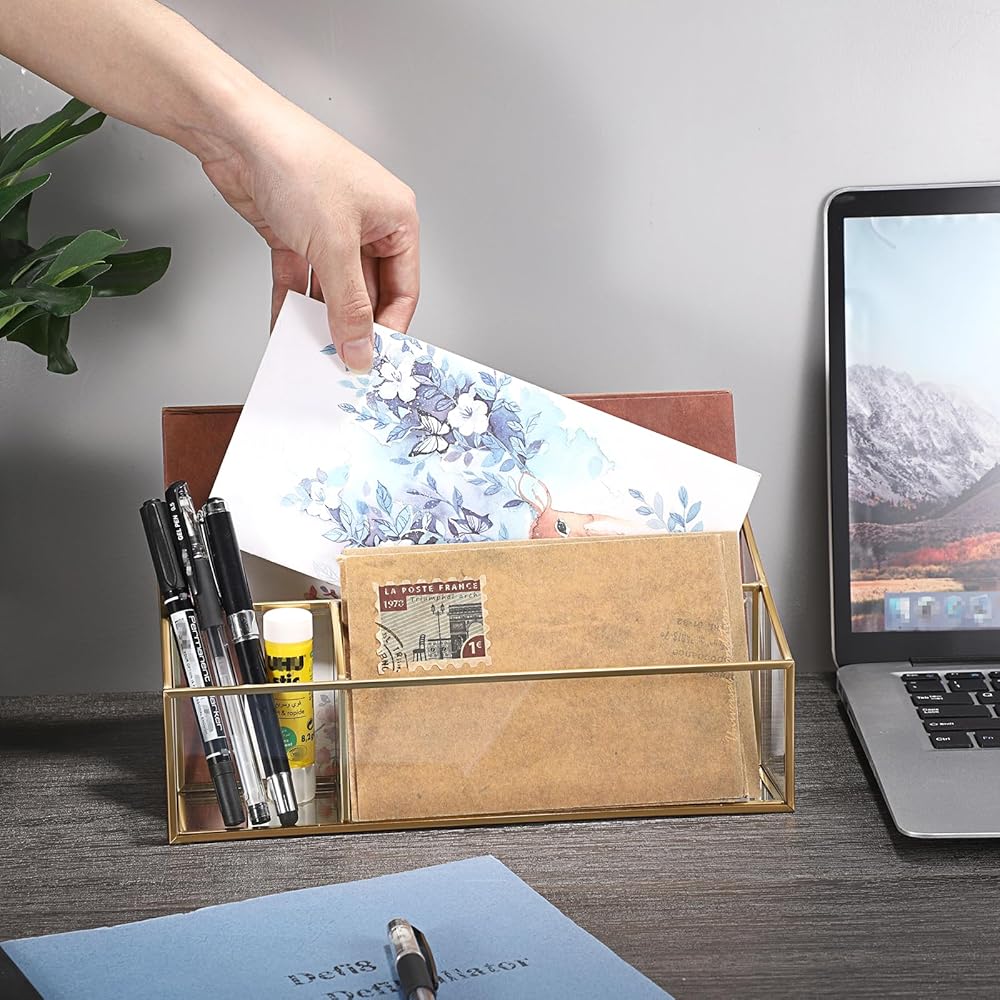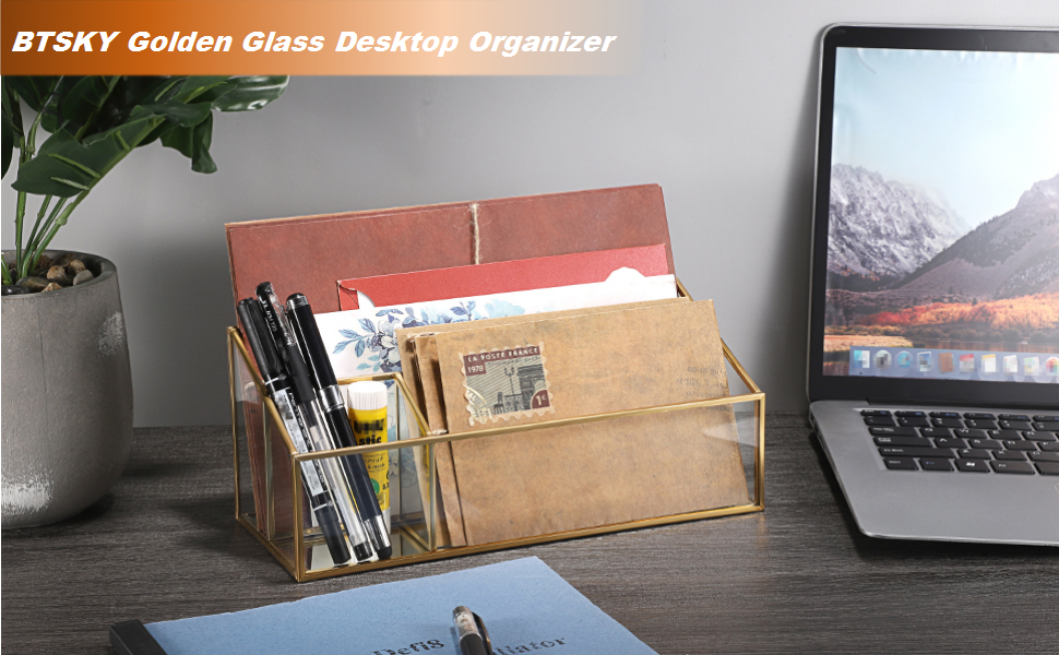 منظمو المكتب من الزجاج الذهبي BTSKY، منظمو البريد، منظمو الفواتير، ملحقات سطح المكتب ومنظمات مساحة العمل مع فتحتين لحامل البريد، فارز الرسائل وحامل القلم والقلم الرصاص
