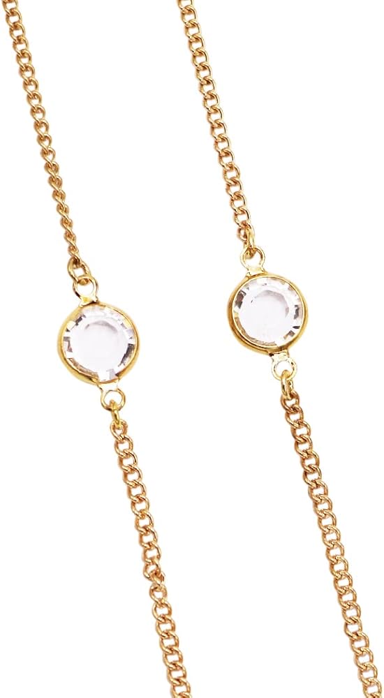 Stunning lightweight single row polished gold tone metal fashion chain with dainty clear glass crystal rhinestones accents, making this stand an eye catching stand out item for your reading or prescription eye wear.