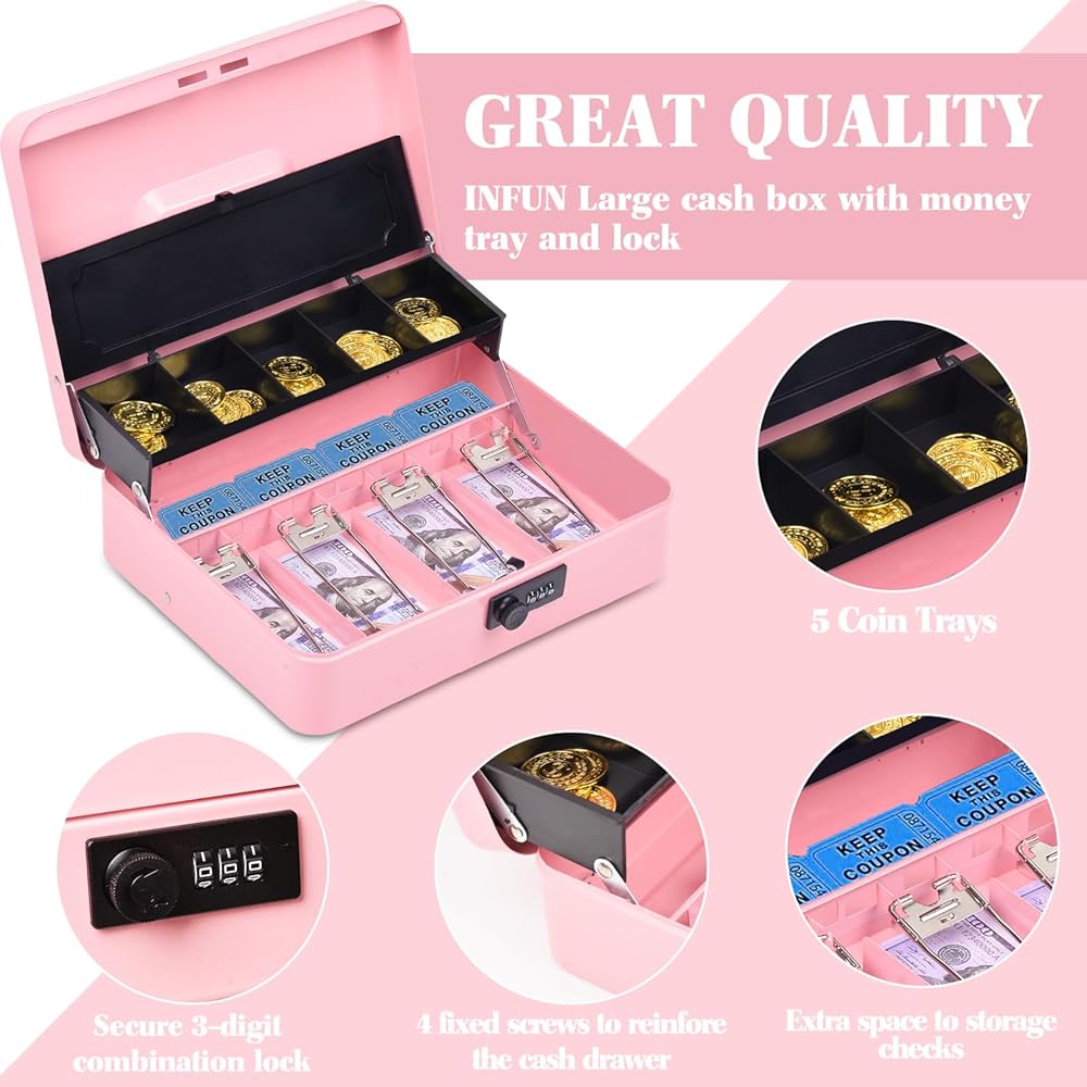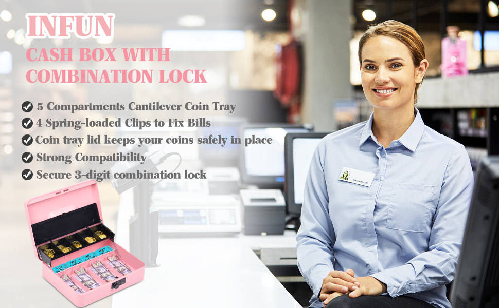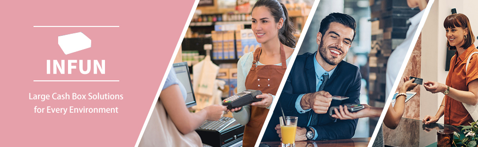 صندوق نقود متين: صندوق نقود INFUN الخاص بنا مصنوع من الفولاذ الثقيل من أجل القوة والحماية والاستخدام لفترة طويلة. لا تنفجر مفتوحة حتى لو سقطت. صندوق نقود مثالي للشركات الصغيرة، فهو يتميز بطبقة نهائية من المسحوق لمقاومة التآكل والتآكل، مما يمنحه مظهرًا احترافيًا.