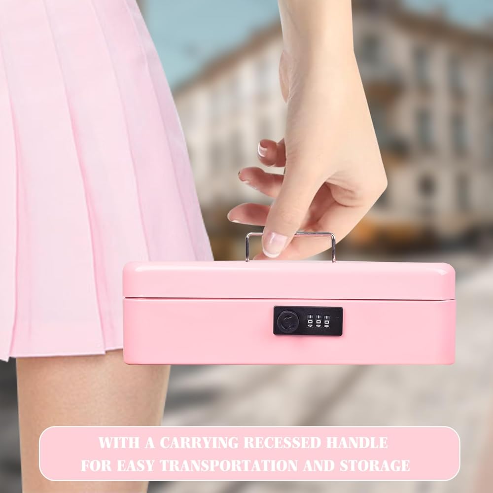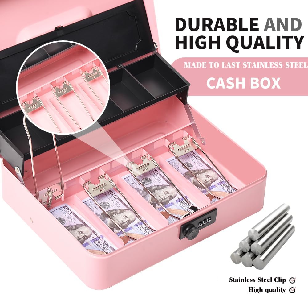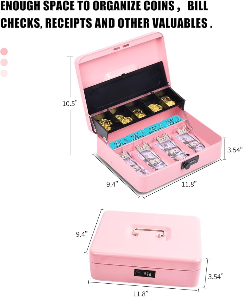 قفل مجمع آمن مكون من 3 أرقام: يحافظ صندوق الأمان النقدي المتين على أمانك الثمين من خلال نظام قفل مركب مكون من 3 أرقام قابل لإعادة الضبط تم ترقيته حديثًا. قم بإعداد وإعادة تعيين مجموعة كلمة المرور الخاصة بك في أي وقت، مما يسمح بمئات من خيارات الرموز المجمعة المخصصة. يأتي صندوق النقود الخاص بنا أيضًا مزودًا بكابل أمان لقفل خزنتك في الدرج أو في أي مكان لمزيد من الأمان.