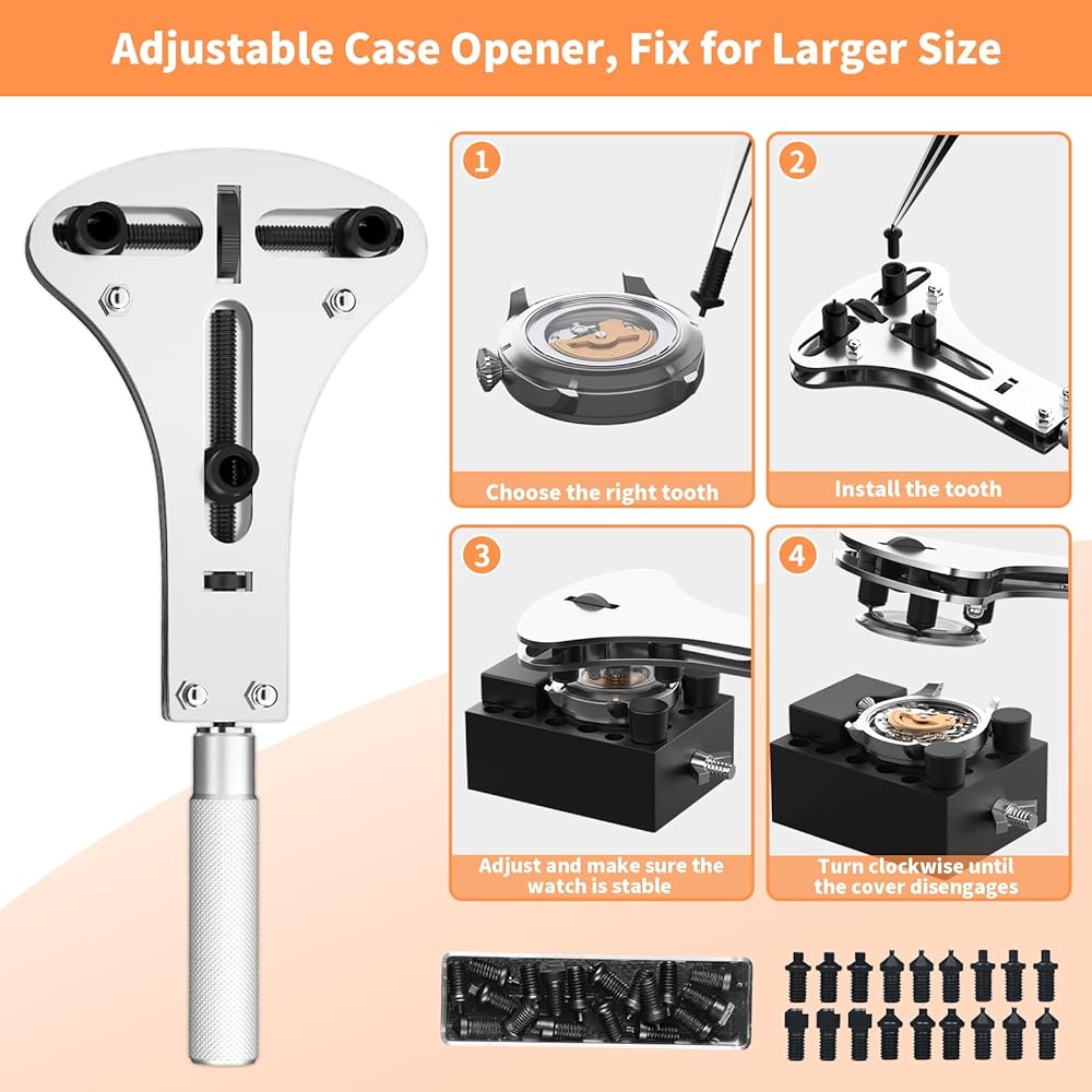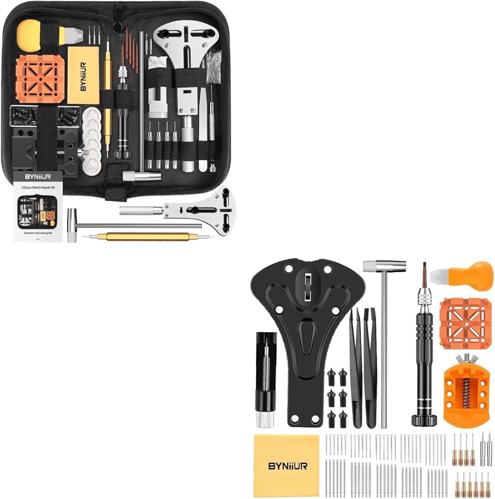 • تشتمل مجموعة أدوات إصلاح الساعة الشاملة من BYNIIUR على أداة فتح علبة الساعة القابلة للتعديل، وحامل الساعة، وسكين فك، وأداة إزالة رابط سوار الساعة، وحامل الوصلات، ومفك البراغي، وأداة دفع دبوس الساعة، وملاقط، وأحجام مختلفة من دبابيس الاستبدال، والتي تحل معظم متطلبات إصلاح الساعة مثل فتح ظهر الساعة، وتعديل حزام الساعة، وتغيير بطاريات الساعة، وتنظيف الساعة وصيانتها، وما إلى ذلك.