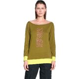 Raw edges at top of sleeve seam and all around neckline for edgy appeal