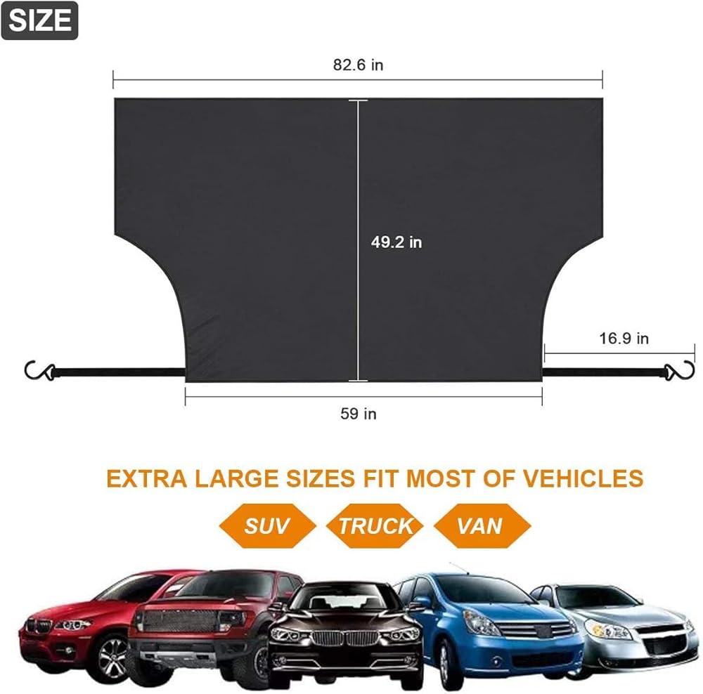 【شاشة ثلج كبيرة جدًا للتغطية الكاملة】حجم مناسب عالمي 82 بوصة × 49 بوصة - يوفر تغطية كاملة للزجاج الأمامي في جميع الأحوال الجوية. يمكن لغطاء الزجاج الأمامي أن يغطي كامل الزجاج الأمامي والمرايا الجانبية بسهولة. يناسب معظم السيارات والشاحنات وسيارات الدفع الرباعي. للتأكد من المقاس الدقيق، يرجى أخذ قياس للزجاج الأمامي الخاص بك قبل شرائه.