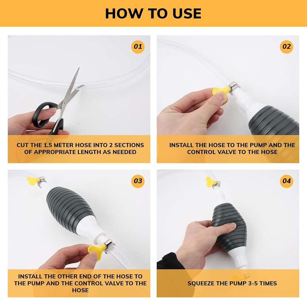 محمول وفعال: خرطوم سيفون بطول 4.9 قدم خفيف الوزن وصغير الحجم، مما يجعله سهل الحمل للغاية وسهل الاستخدام. يضمن تصميمه المريح الراحة والتشغيل الخالي من المتاعب. مع مضخة مدمجة، يسمح لك خرطوم السيفون هذا بنقل السوائل بسهولة من حاوية إلى أخرى، مما يوفر لك الوقت والجهد.