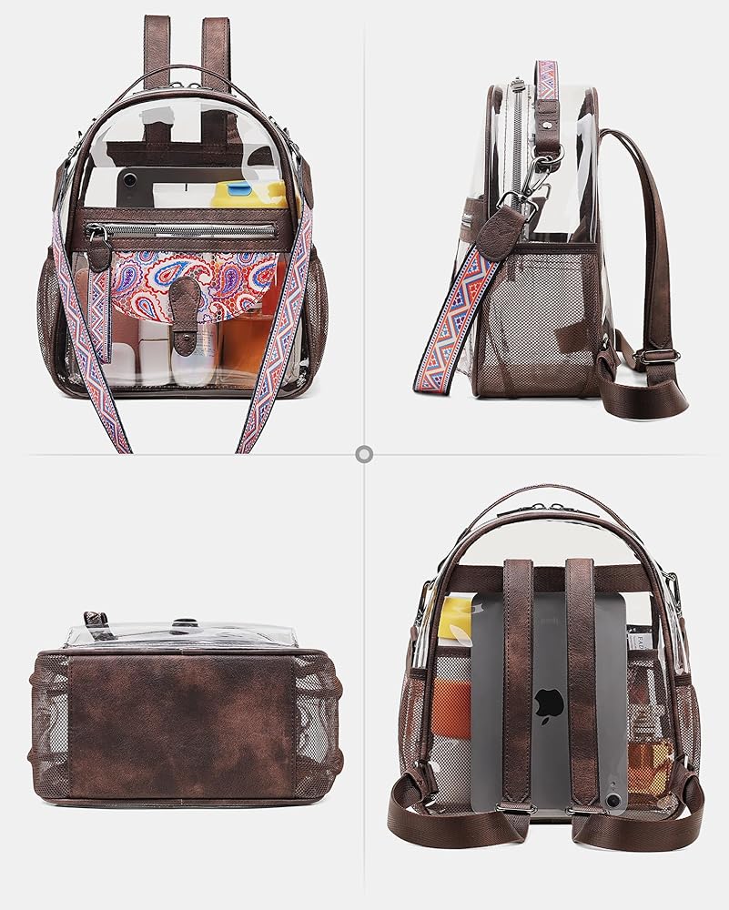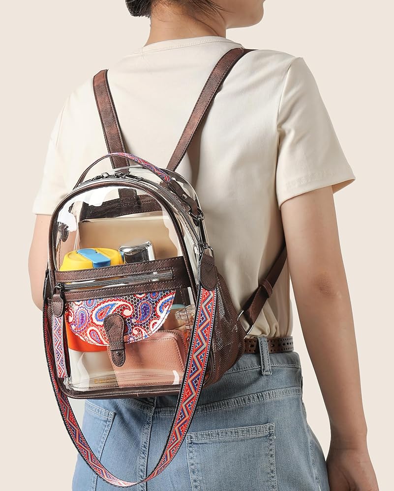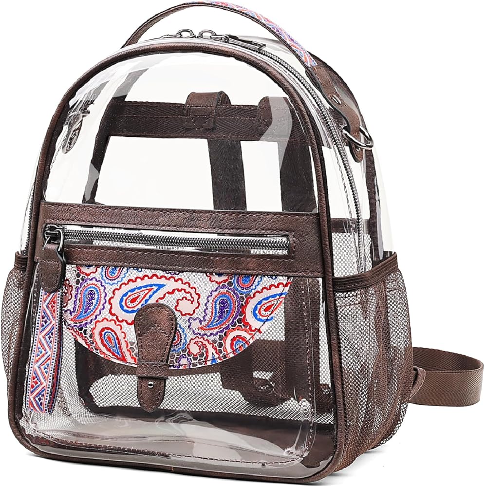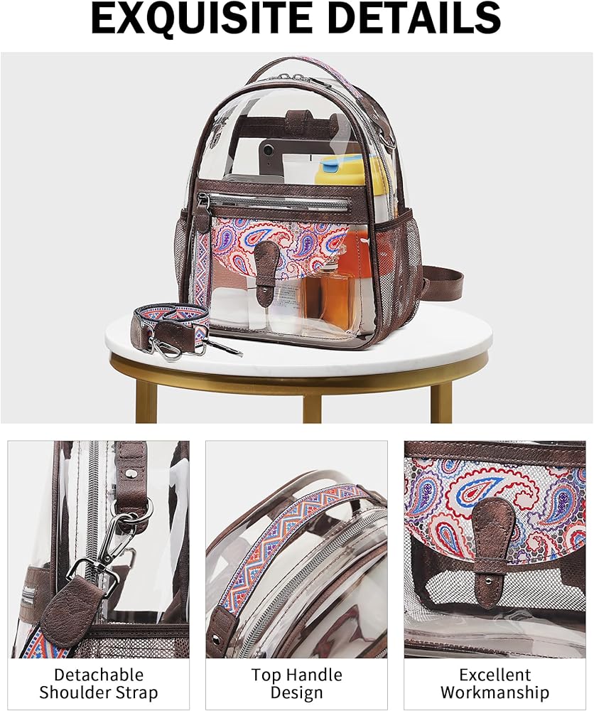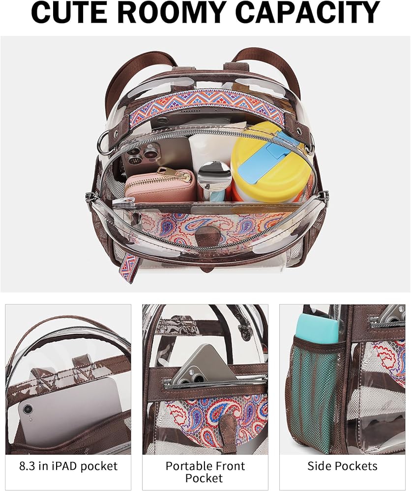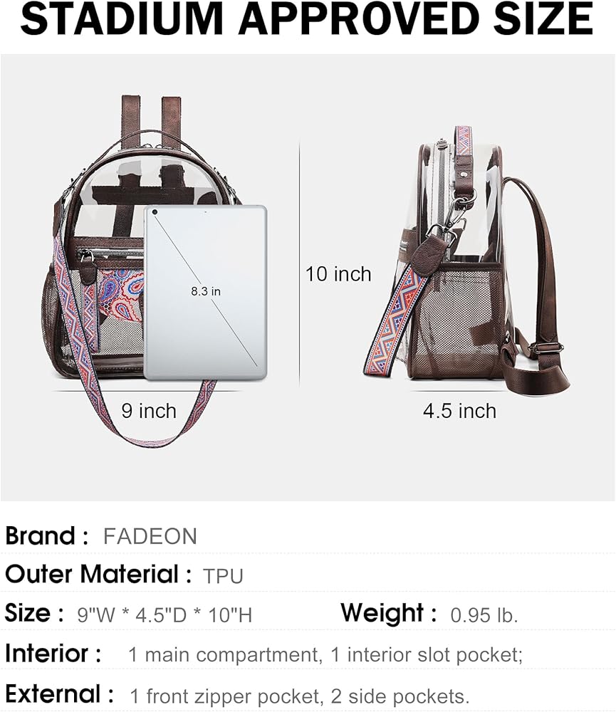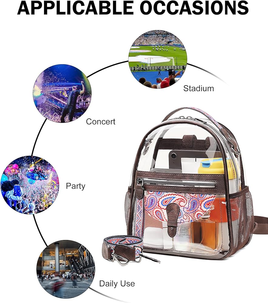 معتمدة من FADEON Clear Mini Backpack Stadium: حجم حقيبة الظهر الصغيرة الشفافة هذه هو 9 بوصة عرض * 4.5 بوصة عمق * 10 بوصة ارتفاع، مما يلبي متطلبات حجم الملعب لحقائب الظهر الشفافة، حتى تتمكن من حمل حقيبة الظهر الشفافة هذه إلى الملعب، بالإضافة إلى الحفلات الموسيقية والعمل والتسوق والمواعدة والسفر والمهرجانات والاستخدام اليومي، فهي حقيبة ظهر صغيرة مصممة لتناسب مختلف المناسبات.