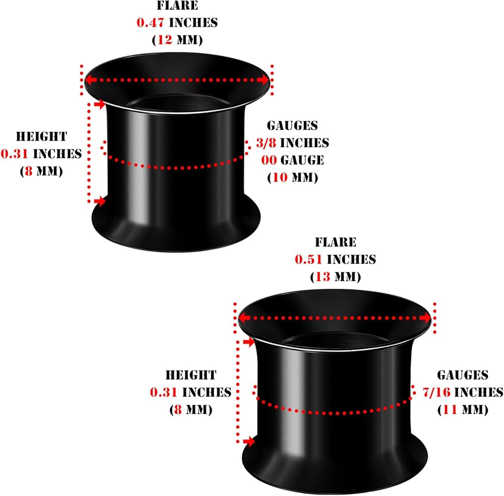 YOU RECEIVE 2 Pairs of 00g 3/8" 10mm Black Anodized Surgical Steel Double Flared Tunnel Plugs (Solid) . 2 Pairs of 7/16 inch Gauge 11mm Black Anodized Surgical Steel Tunnels Double Flare (Solid) .