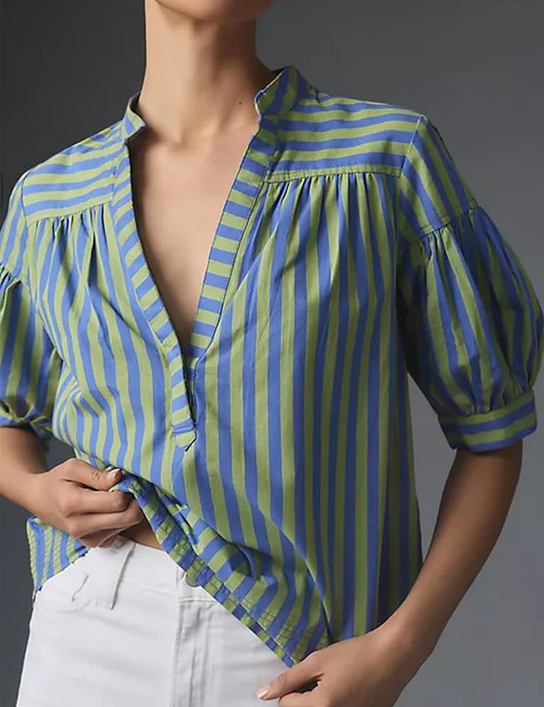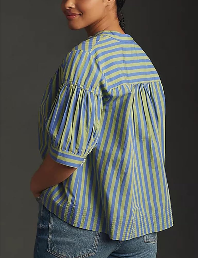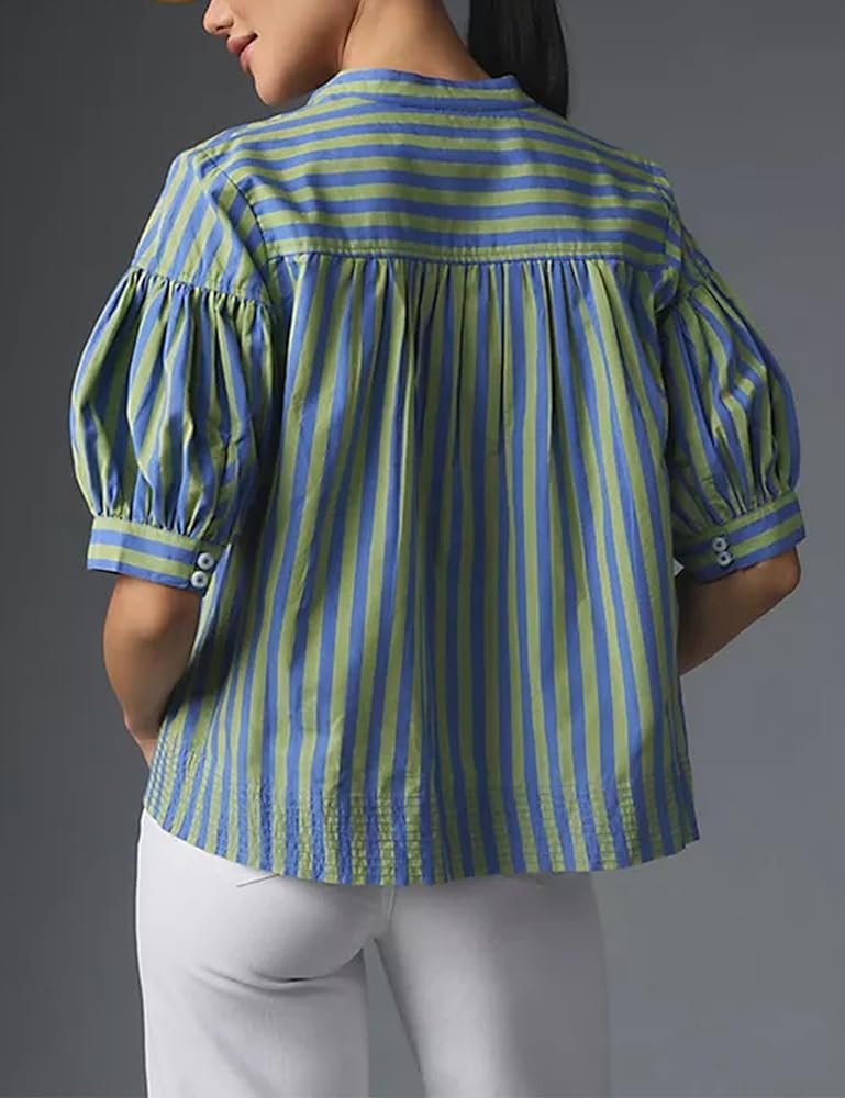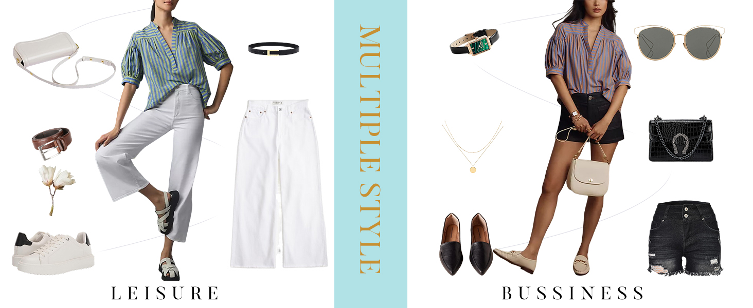 المطابقة: هذا الجزء العلوي المخطط ذو الطيات يمكن أن يلبي احتياجات الأنماط المتعددة. يجعل الإحساس الشكلي من السهل ارتداؤه مع السراويل الرسمية للأناقة والراحة، في حين أن اللون النابض بالحياة والمقاس الفضفاض يجعله غير رسمي في نفس الوقت. تضيف الطيات وأساور الأزرار إلى المنتج إحساسًا بالتصميم، ويمكنك أيضًا ارتداؤه مع السراويل القصيرة أو التنانير أو الأحذية الرياضية أو الصنادل، قوية وأنيقة