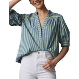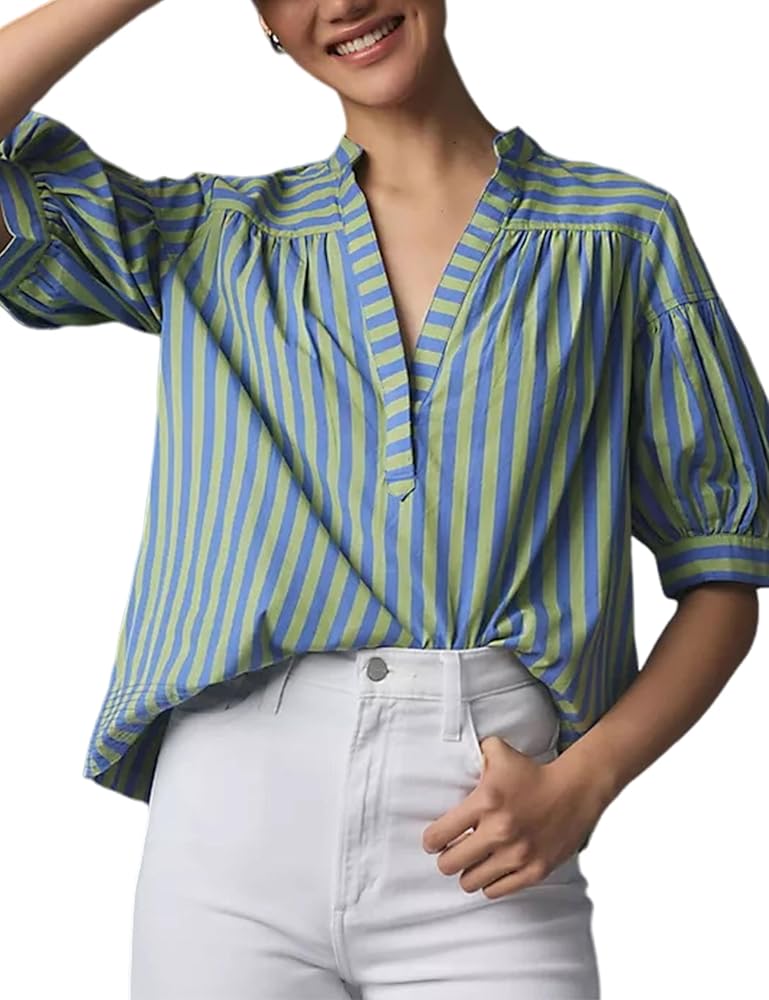 السمات: سترة بلوفر مخططة للسيدات تتميز بمخططة، وأكمام قصيرة مع أزرار، ورقبة على شكل حرف V، وتفاصيل مطوية، نمط فضفاض يجعلها لا تلتصق بجسمك، وتوفر تصميمًا متأرجحًا وتدفقًا لطيفًا، مما يظهر مظهرًا كاجوال ولكن عصري، فضفاض لكن أنيقة