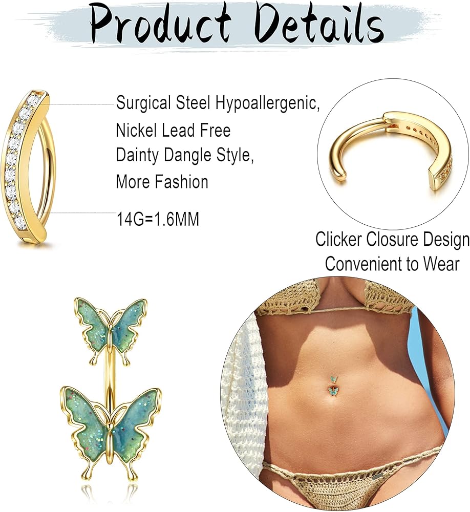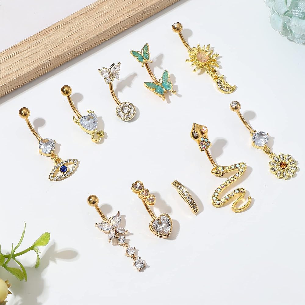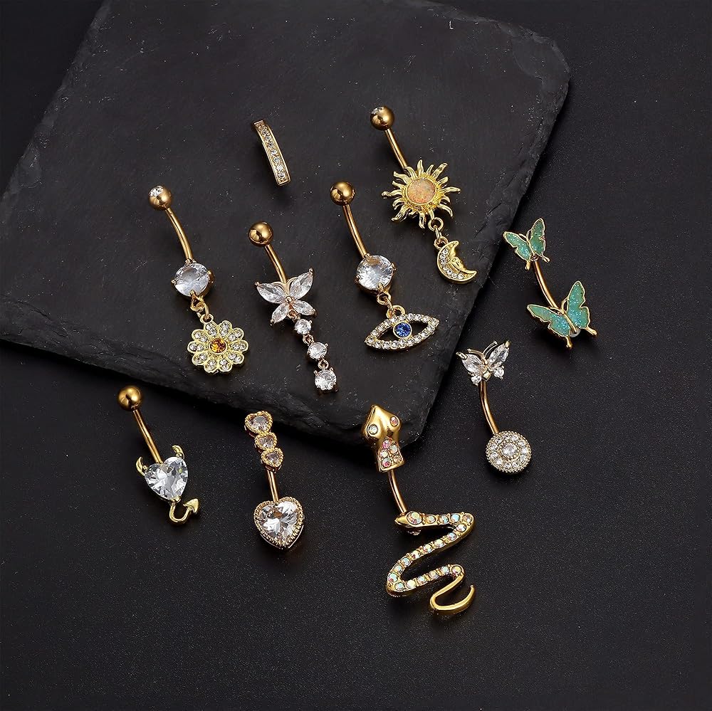 • مجموعة حلقات أزرار البطن: تأتي مع 10 قطع من أنماط مختلفة من حلقات أزرار البطن في المجموعة. حلقة السرة الكلاسيكية الدائرية CZ، حلقة زر البطن على شكل عين شريرة، جرس السرة المنحني على شكل فراشة، حلقة زر البطن الفرس، حلقة زر البطن المتدلية على شكل ثعبان، حلقة السرة العكسية على شكل قلب. مليئة بالنشاط والحيوية