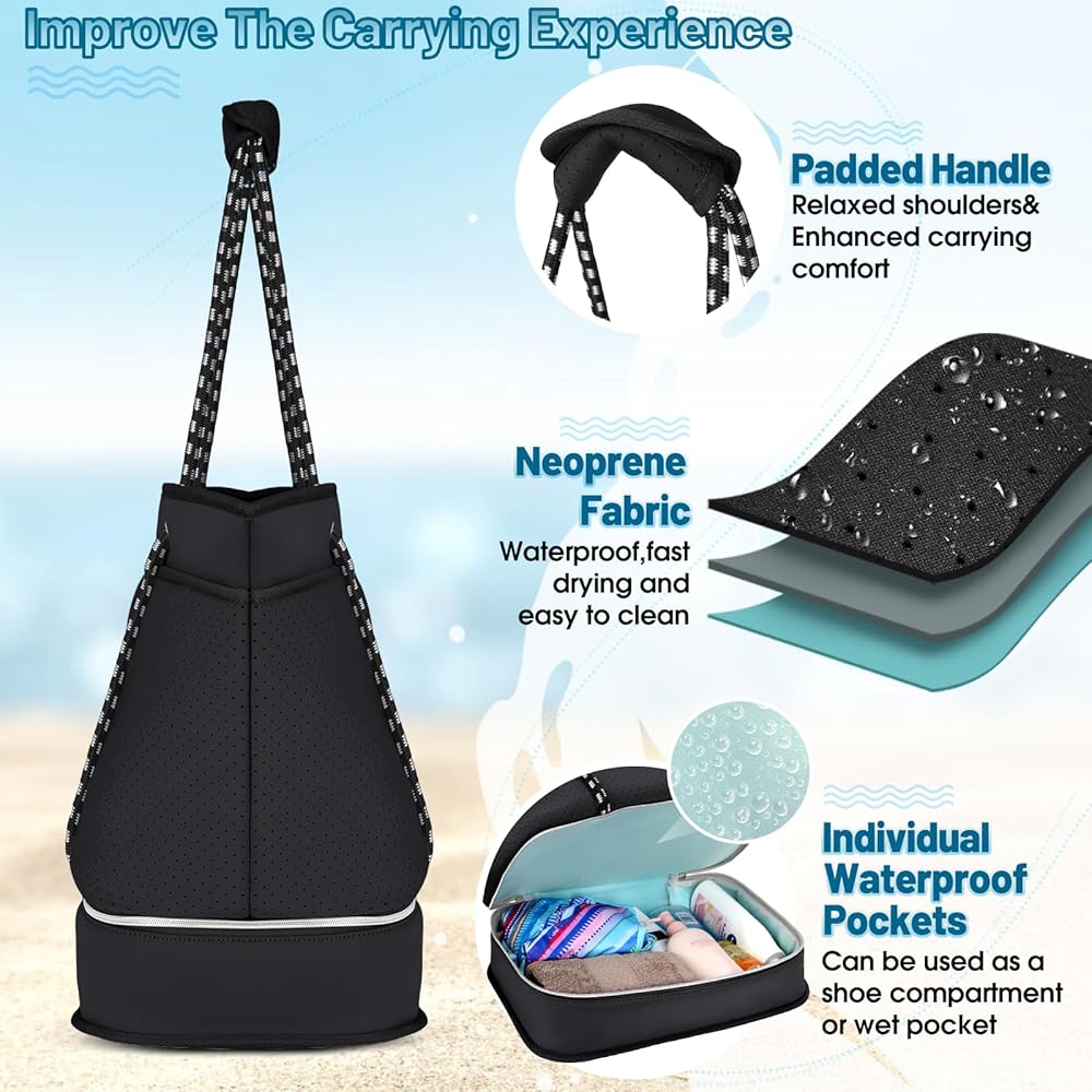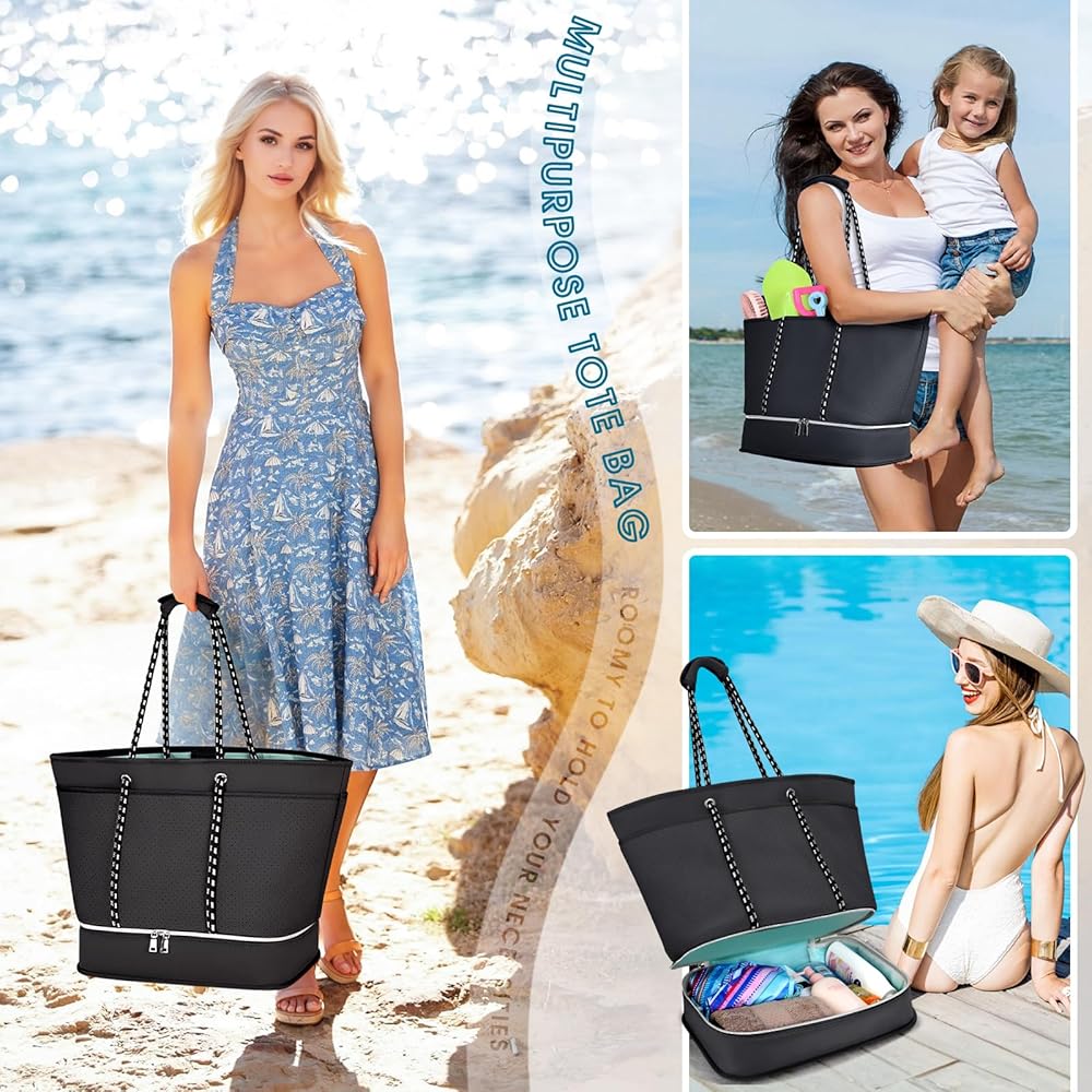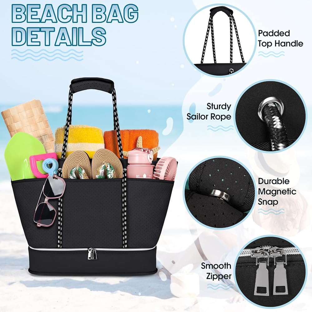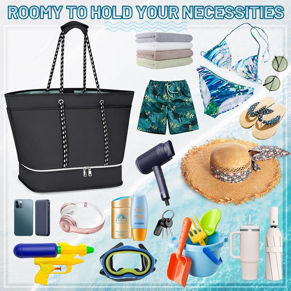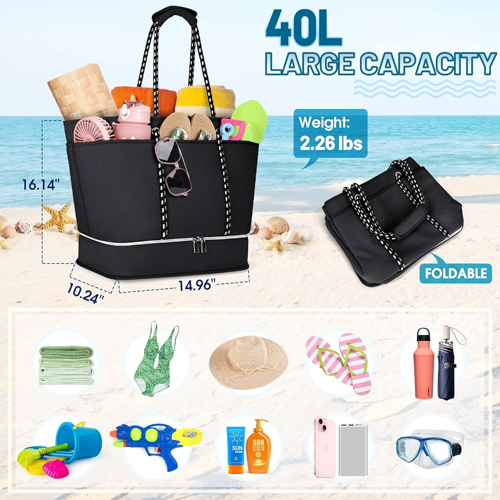 【Durable Construction】Beach bag size:14.96*10.24*16.14 inch,Weight:2.26lbs,Capacity: 40L.Made from high-quality neoprene, beach tote bag is designed to withstand the wear and tear of regular use, making it a reliable choice for frequent beachgoers and travelers.Equipped with sturdy and comfortable handles and shoulder straps, womens beach bag is easy to carry even when fully loaded.