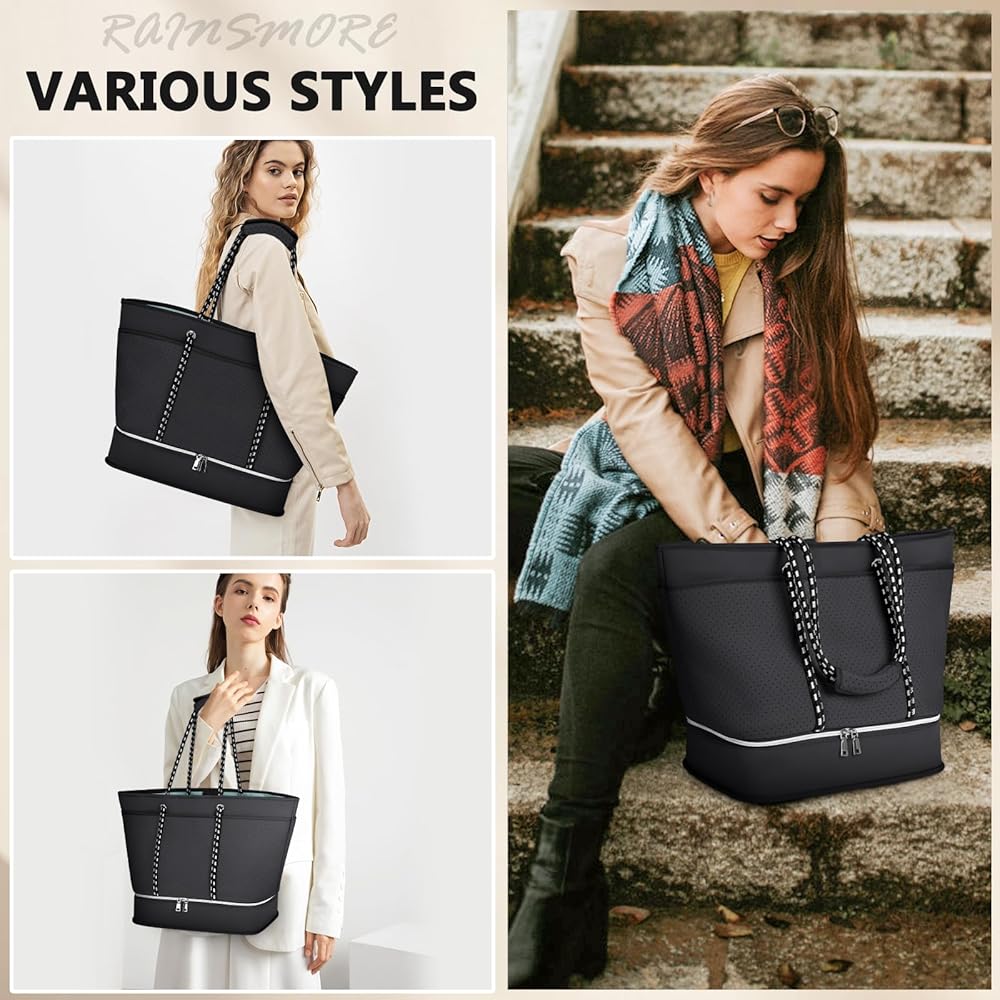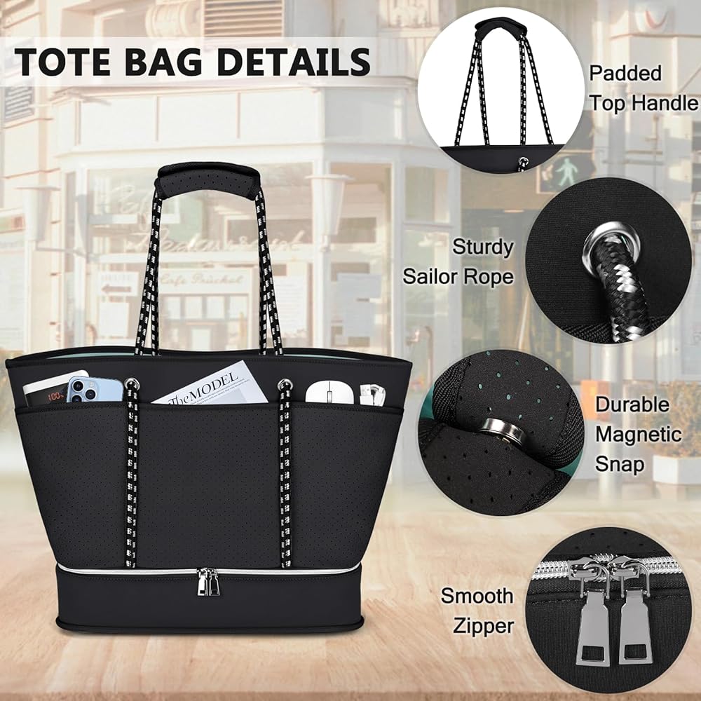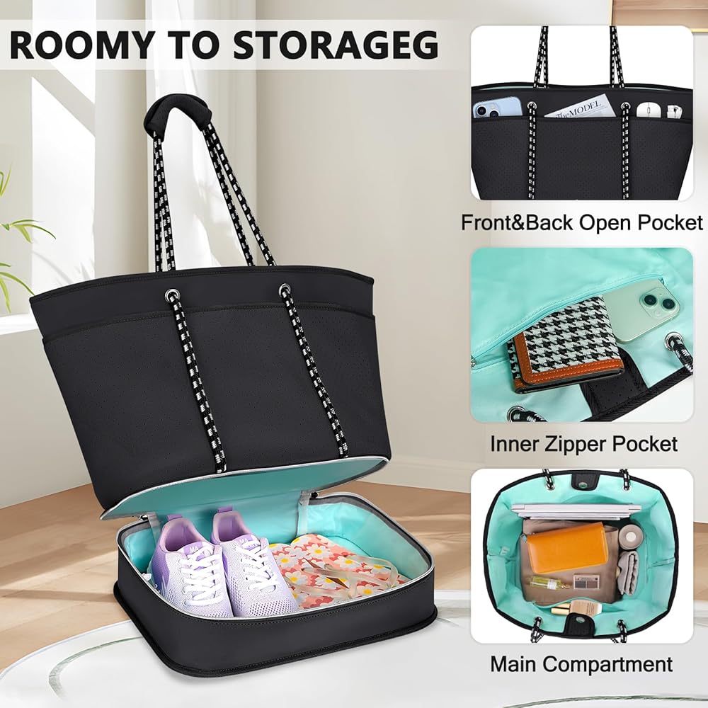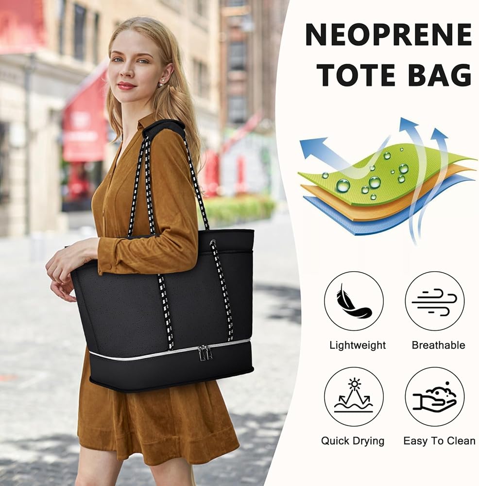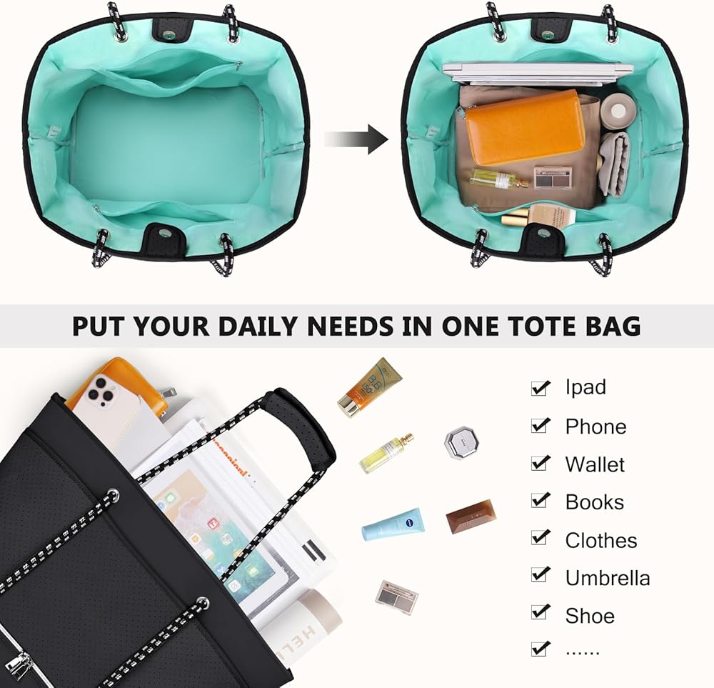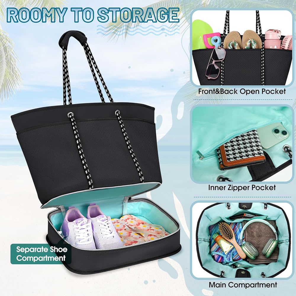 【Durable Construction】Beach bag size:14.96*10.24*16.14 inch,Weight:2.26lbs,Capacity: 40L.Made from high-quality neoprene, beach tote bag is designed to withstand the wear and tear of regular use, making it a reliable choice for frequent beachgoers and travelers.Equipped with sturdy and comfortable handles and shoulder straps, womens beach bag is easy to carry even when fully loaded.