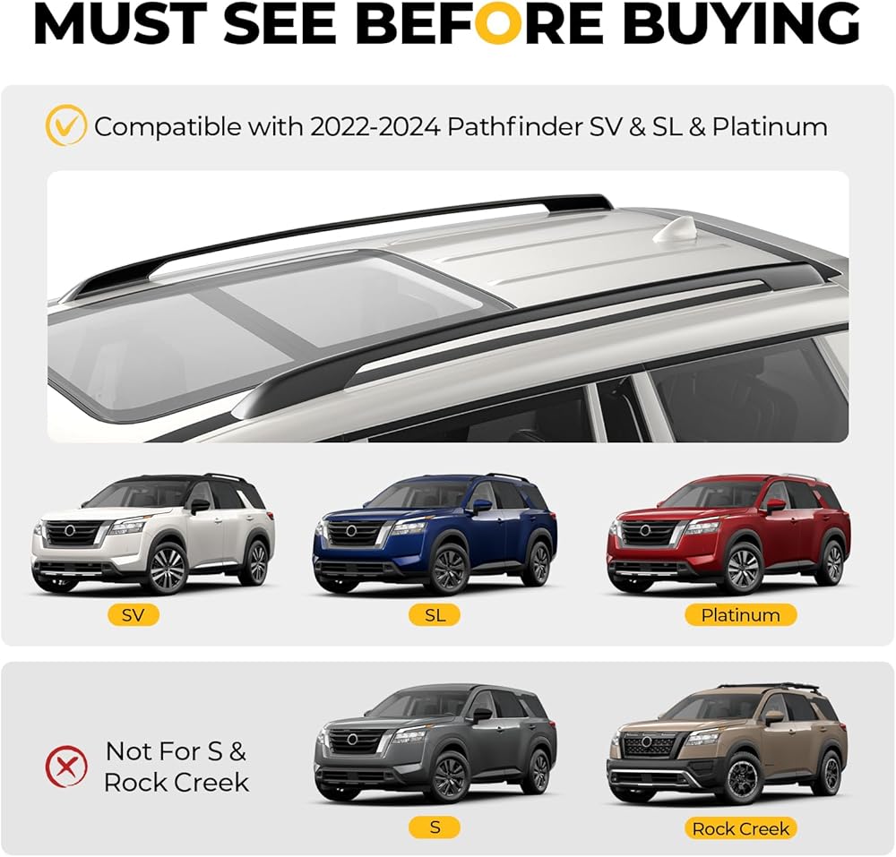 【التوافق: متوافق مع Nissan Pathfinder 2022 2023 2024 مع قضبان جانبية لسقف المصنع، بما في ذلك الزخارف SV وSL والبلاتينية. ملحوظة: ليس مخصصًا لـ S وRock Creek.