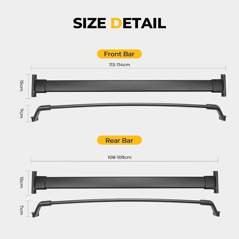 [سهلة التركيب] لا حاجة للحفر أو القطع. يتم ربط قضبان BougeRV المتقاطعة بالجزء الداخلي من قضبان السقف بإدخالات مطاطية لمزيد من الحماية. العارضة الأمامية أطول من الخلفية لاستيعاب حجم السيارة.