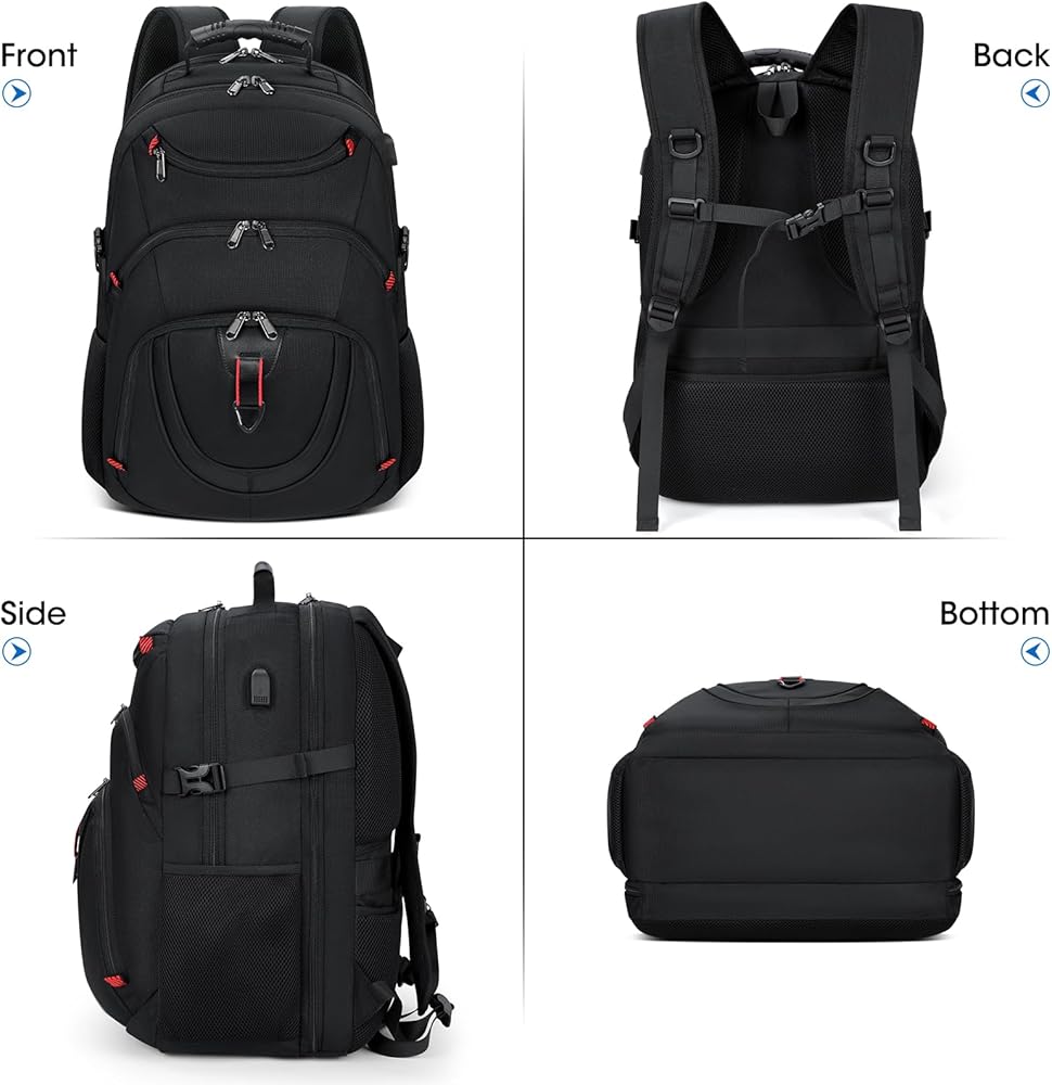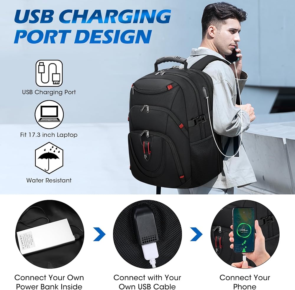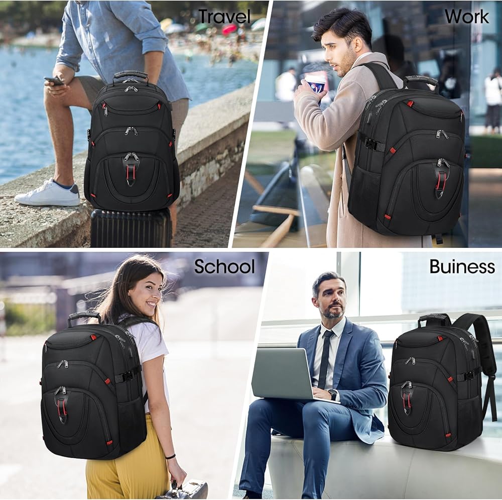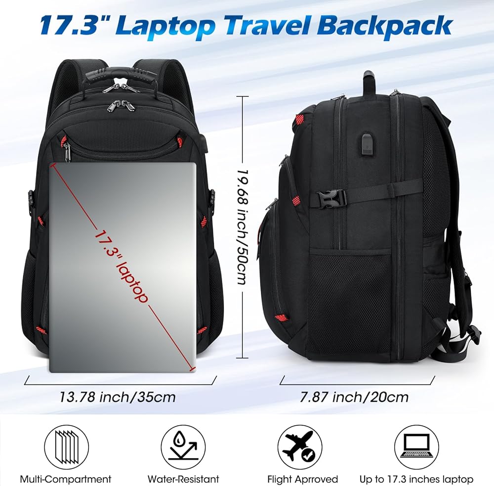 حقيبة ظهر للكمبيوتر المحمول RAINSMORE مقاس 17 بوصة حقيبة ظهر مضادة للماء للسفر من إدارة أمن المواصلات الأمريكية (TSA) حقيبة ظهر كبيرة جدًا للكلية مقاس 17.3 حقيبة ظهر للكمبيوتر المحمول للرجال والنساء مع منفذ شحن USB حقيبة كتب للعمل باللون الأسود
