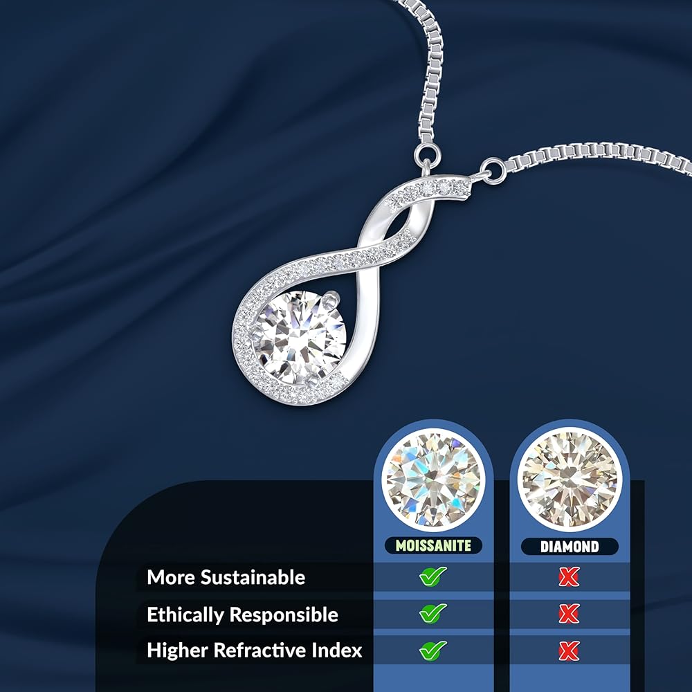 حجر مويسانيتي خالي من العيوب ومعتمد من GRA: مع زوايا مصقولة بشكل مثالي وخطوط نظيفة، يعد حجر مويسانيتي VVS1 1 قيراط المعتمد من GRA خيارًا ممتازًا لأولئك الذين يبحثون عن أسلوب حديث ومتطور؛ شفاف مثل حجر الماس الطبيعي عالي الجودة، فإن قلادة إنفينيتي المصنوعة من الماس المويسانتي ستجذب كل الاهتمام بينما تخلق ذاكرة مثالية.