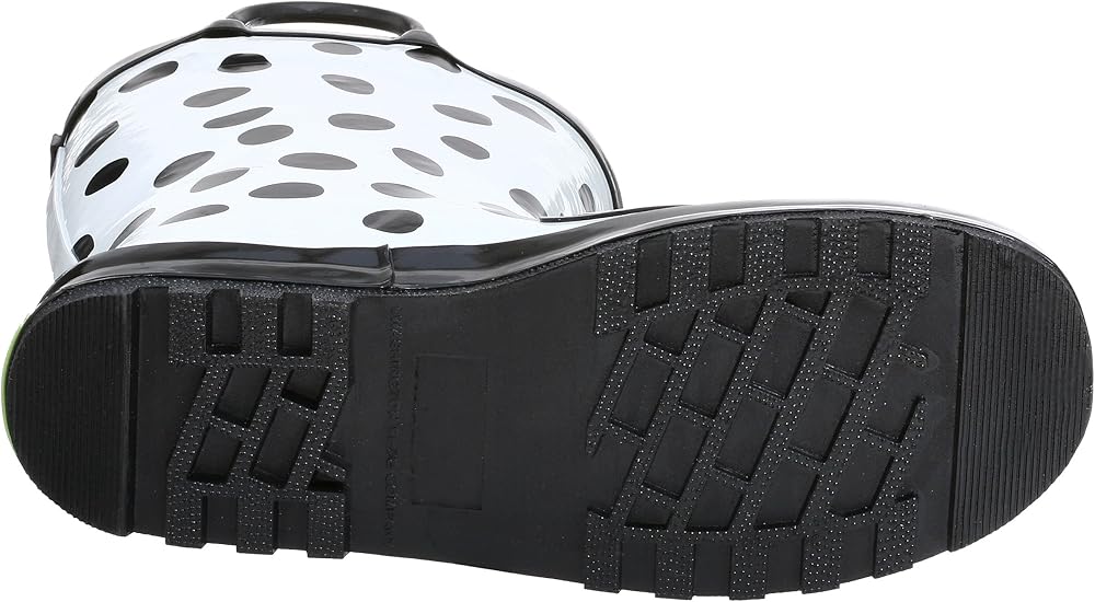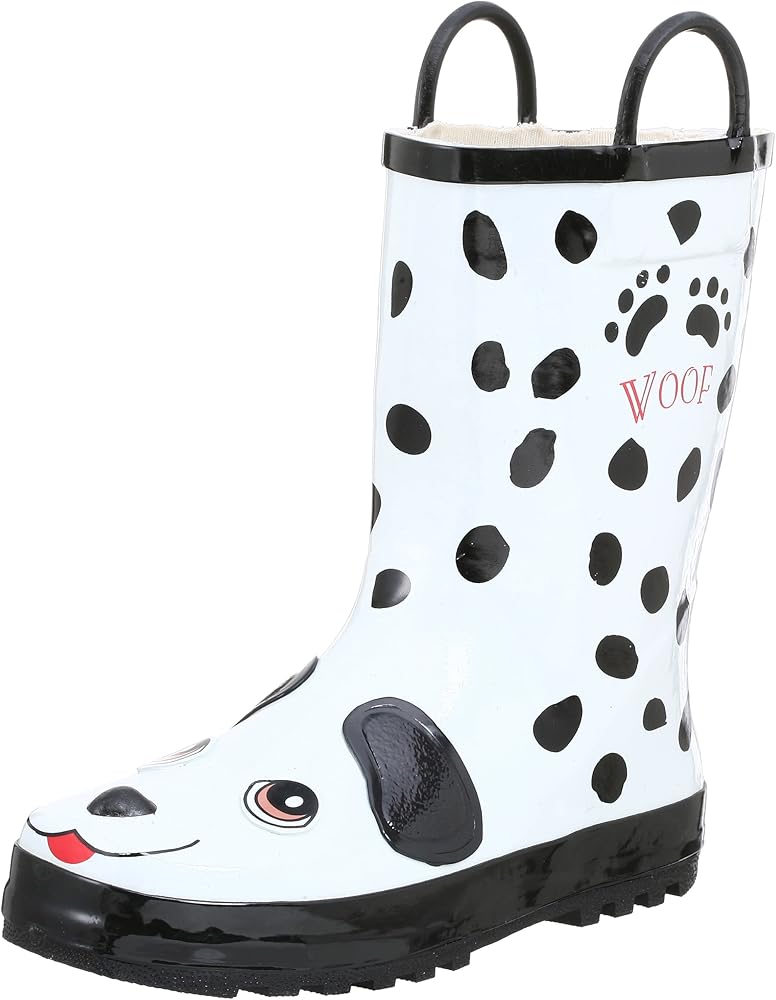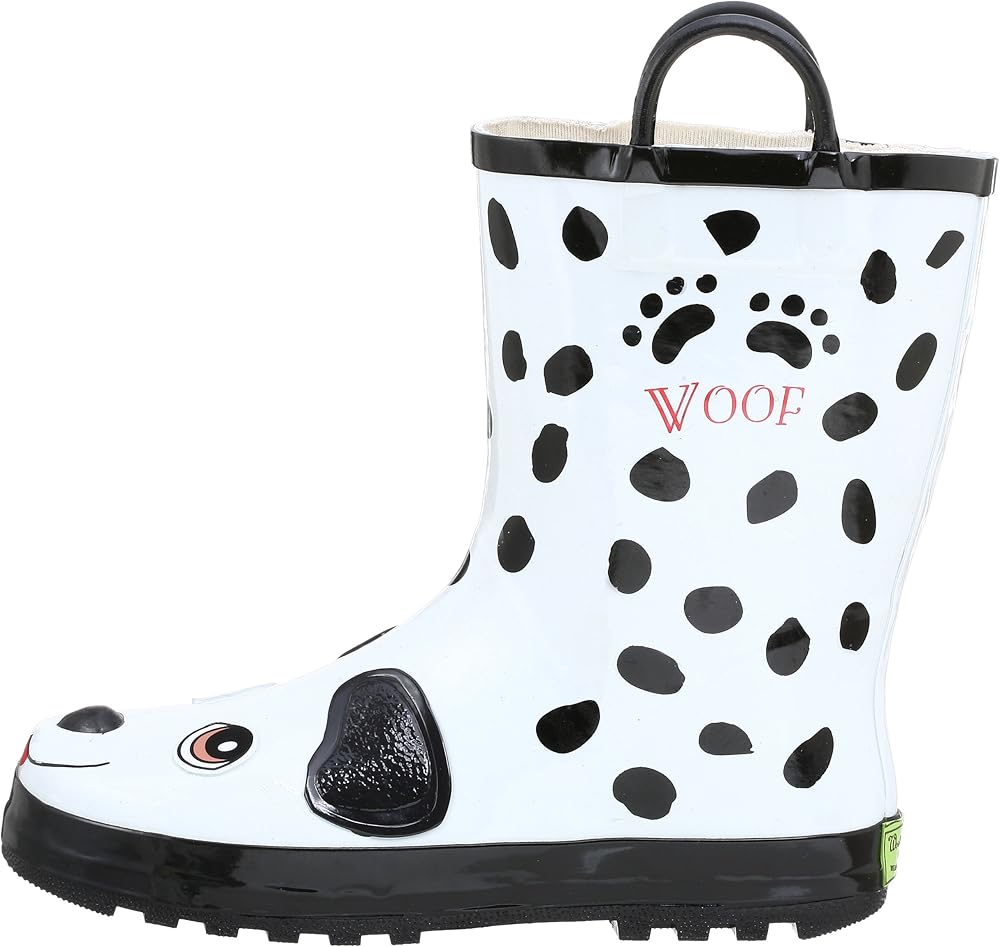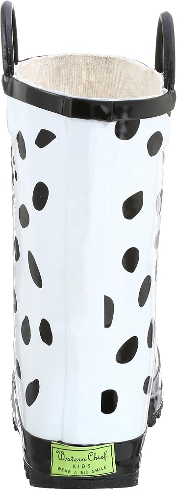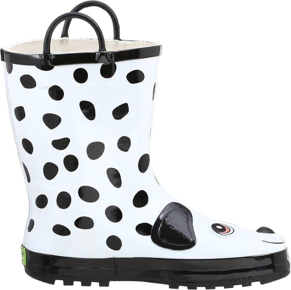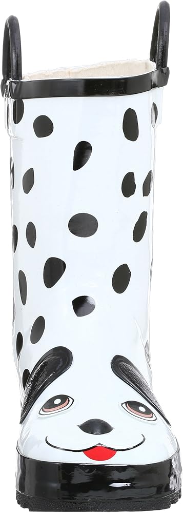 Brightly designed, fanciful and fun, your child will be ready for the playroom or the playground in this charming Dalmation rainboot. It features a waterproof upper with easy-on handles, plus a skid-resistant outsole and moisture-absorbing cotton lining that will dry quickly when the puddle-splashing fun is over.