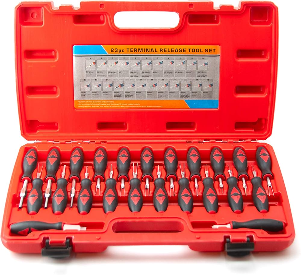 Perfect for removing terminals from coolant sensors,wiring harness connectors and terminal blocks. Easy to use and to operate at affordable prices. A perfect helper for cars electricians or mechanics Case Color: red Carry Case Size: 35.5*25.5*5.5cm Material: stainless steel + soft grip plastic handle Features: Professional automotive connector terminal release set. A carry case for portable taken and so convenient. Wide range of applications and universal fit for most auto in the market. Remove barbed terminals from terminal blocks. Ergonomic design for comfortable handling. In Package: 23x Cars Terminal Release Tool 1x Carry Case