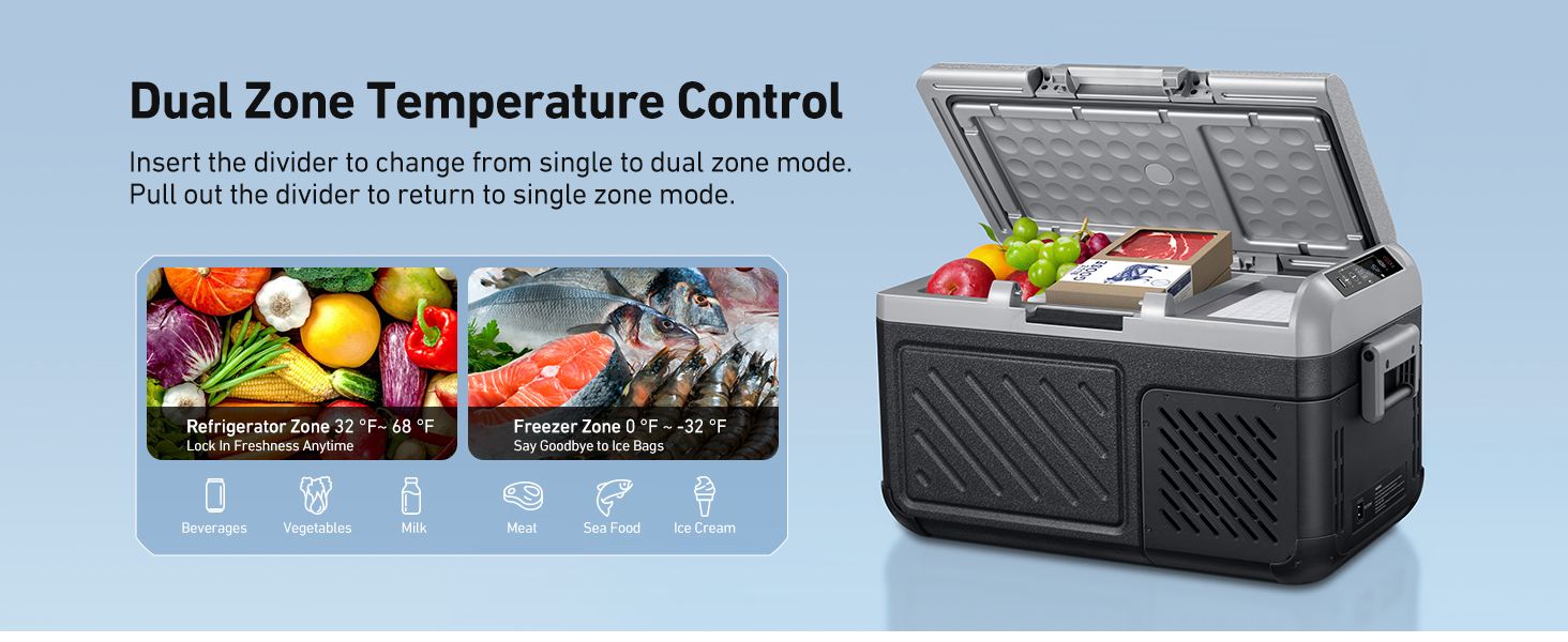 منطقة مزدوجة وتحكم مزدوج في درجة الحرارة: تتيح هذه الثلاجة ذات المنطقة المزدوجة المطورة بقدرة 12 فولت إمكانية تخزين الطعام المنفصل والتحكم المستقل في درجة الحرارة. ما عليك سوى إزالة المقسم المتضمن أو تمريره للتبديل بين وضعي المنطقة الواحدة والمنطقة المزدوجة. في وضع المنطقة الواحدة، يتراوح نطاق درجة الحرارة من 0 إلى 68 درجة فهرنهايت؛ في وضع المنطقة المزدوجة، تتراوح درجات الحرارة بين 0 درجة فهرنهايت إلى 68 درجة فهرنهايت (منطقة التجميد) و32 درجة فهرنهايت إلى 68 درجة فهرنهايت (منطقة الثلاجة). لا مزيد من الطعام الفاسد أو الإفراط في التجميد.