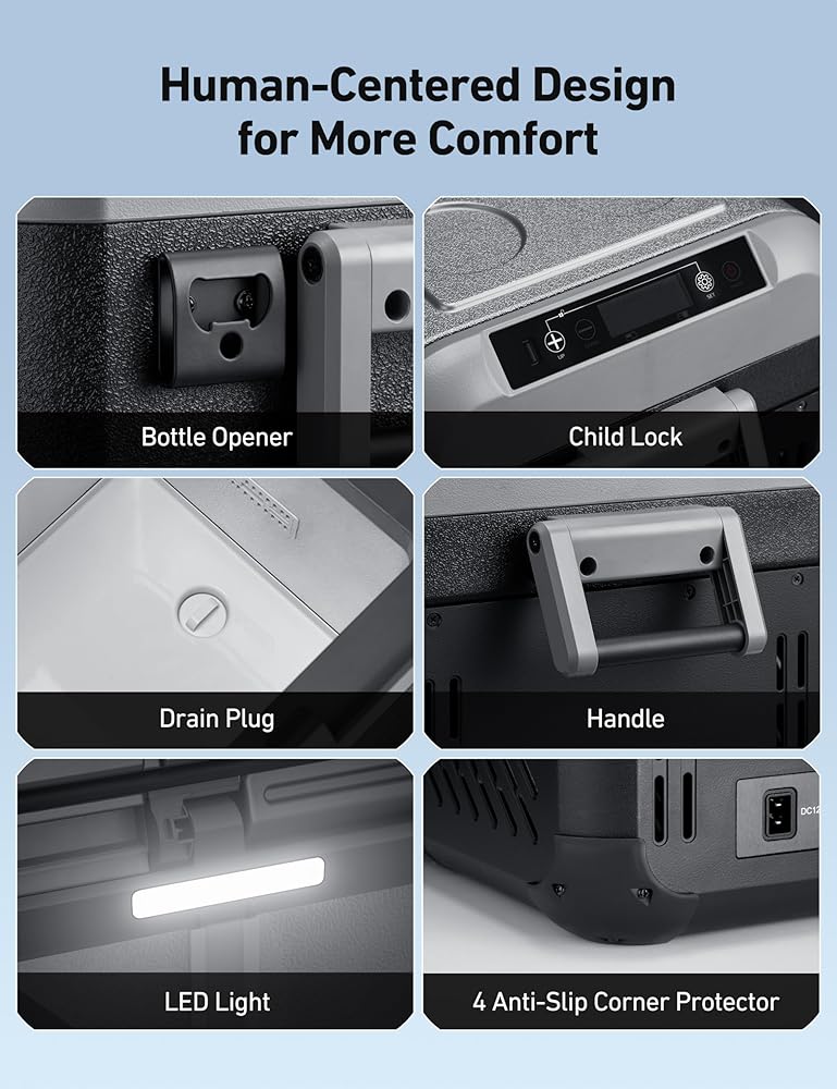 تجربة مستخدم لا مثيل لها: تم تصميم هذه الثلاجة المحمولة ذات المنطقة المزدوجة للاستخدام المريح في كل مناسبة. يحتوي على قفل للأطفال لمنع الفتح العرضي، ومنفذ USB لشحن الأجهزة المحمولة، وإضاءة LED مدمجة للاستخدام في الإضاءة المنخفضة. يشتمل المبرد الكهربائي ثنائي المنطقة أيضًا على قابس ماء وواقي زاوية مضاد للانزلاق، مما يضمن سهولة الاستخدام في أي بيئة.