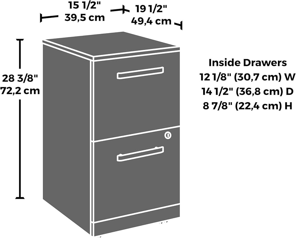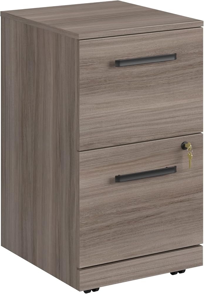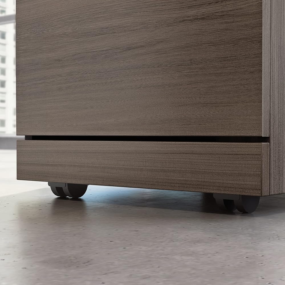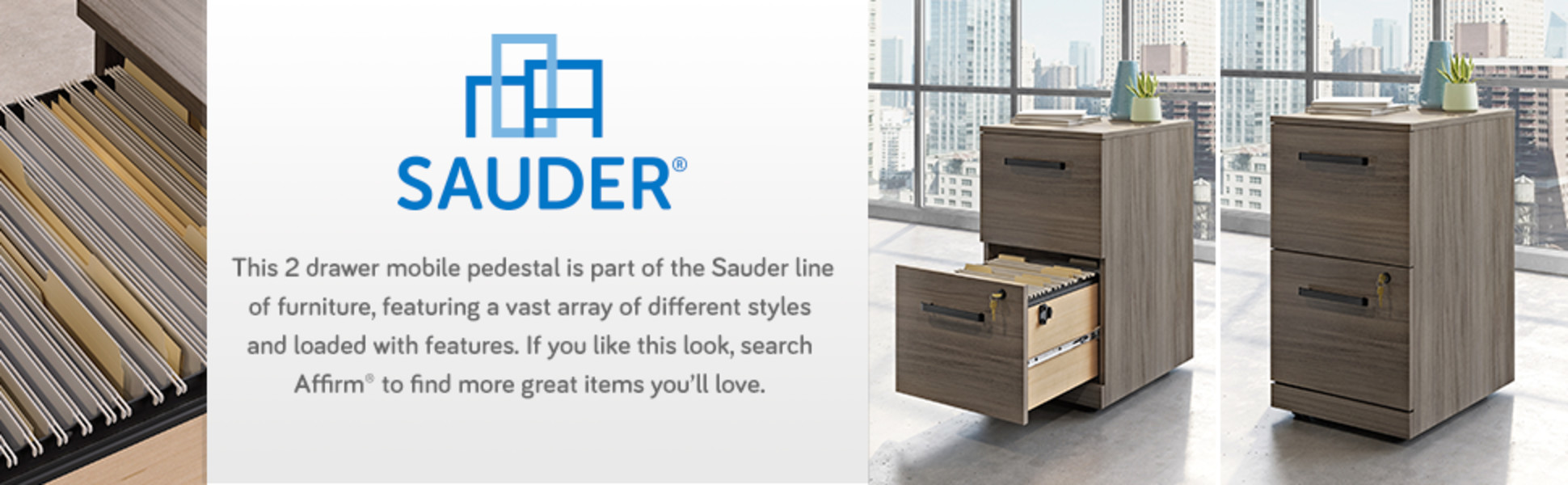To make sure that you have enough file storage space without running low on floor space in your office, look to this 2-drawer pedestal file cabinet from the Affirm® collection. We know your time is precious. That's why commercial filing cabinets like this 2-drawer mobile pedestal come fully assembled, with minimal hardware attachment required. Added security with this filing cabinet features two locking drawers with full extension slides that hold letter or European size hanging files. This office file pedestal ensures that your important documents are secure and organized. With safety in mind, this mobile file cabinet includes an interlocking mechanism that allows only one drawer to open at a time. Rearrangement and flexibility are vital to a vibrant office energy, that's why this file pedestal includes hidden casters for easy mobility. This pedestal file cabinet is finished on all sides for versatile placement in any office. With a Hudson Elm™ finish, this 2-drawer mobile pedestal is the epitome of great commercial office furniture: sturdy, durable, and eye catching.