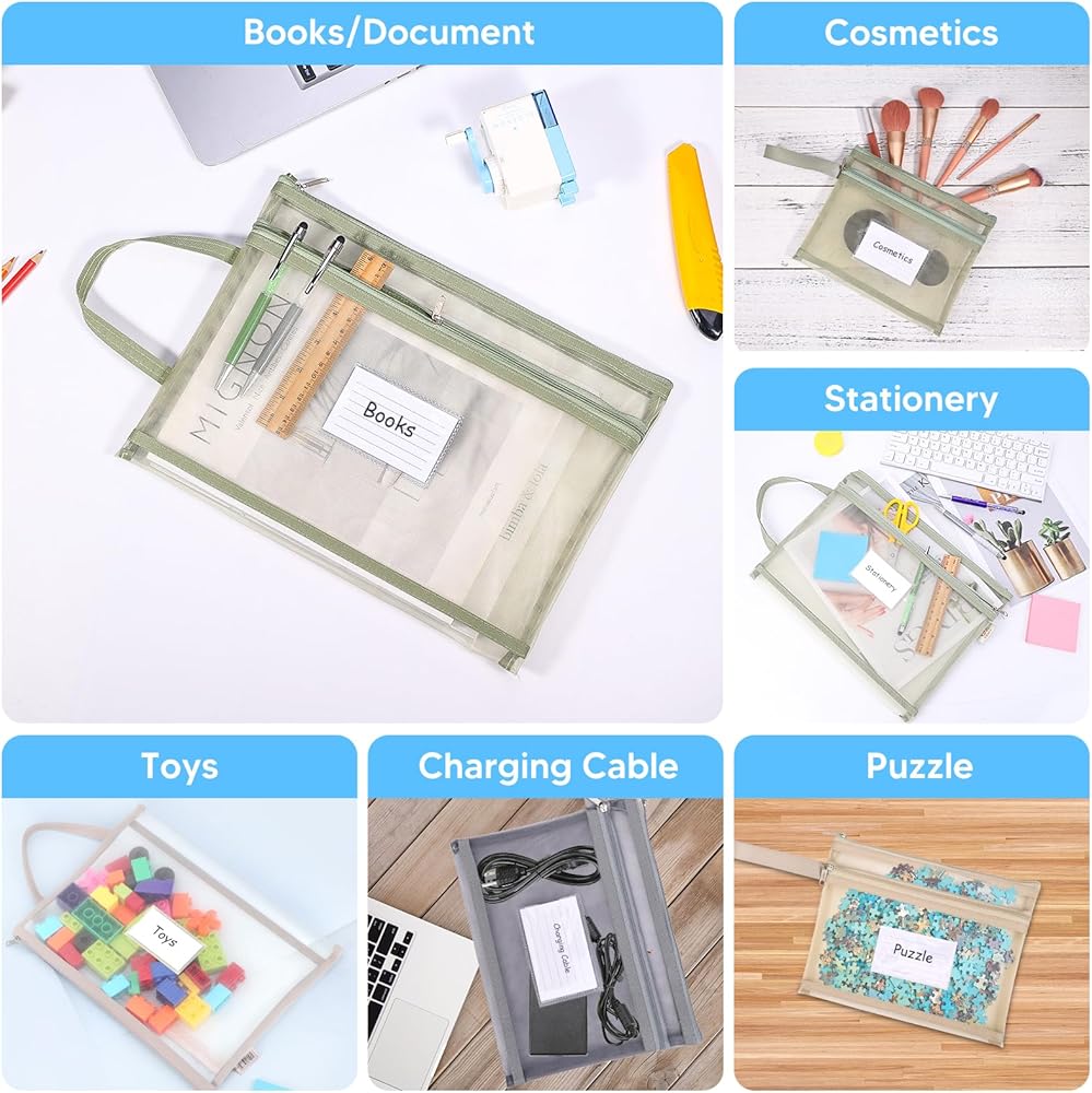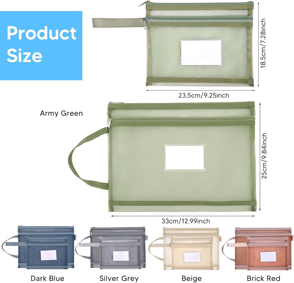 Product Size --- The two sizes of double layer mesh zipper pouches are 33 x 25 cm/12.99 x 9.84 inches and 23.5 x 18.5 cm/9.25 x 7.28 inches. The right size allows you to quickly organize and categorize items of all shapes and sizes at work and at home, such as documents, office supplies, textbooks, homework, toys, puzzles, cosmetics, crafts, travel items, and anything else you can think of.