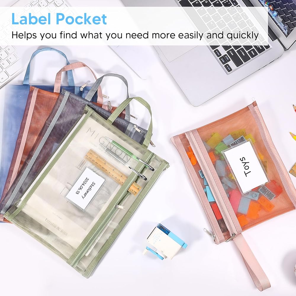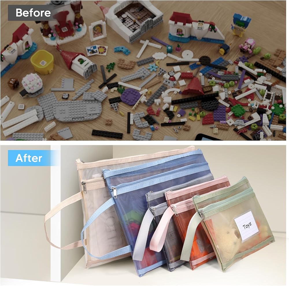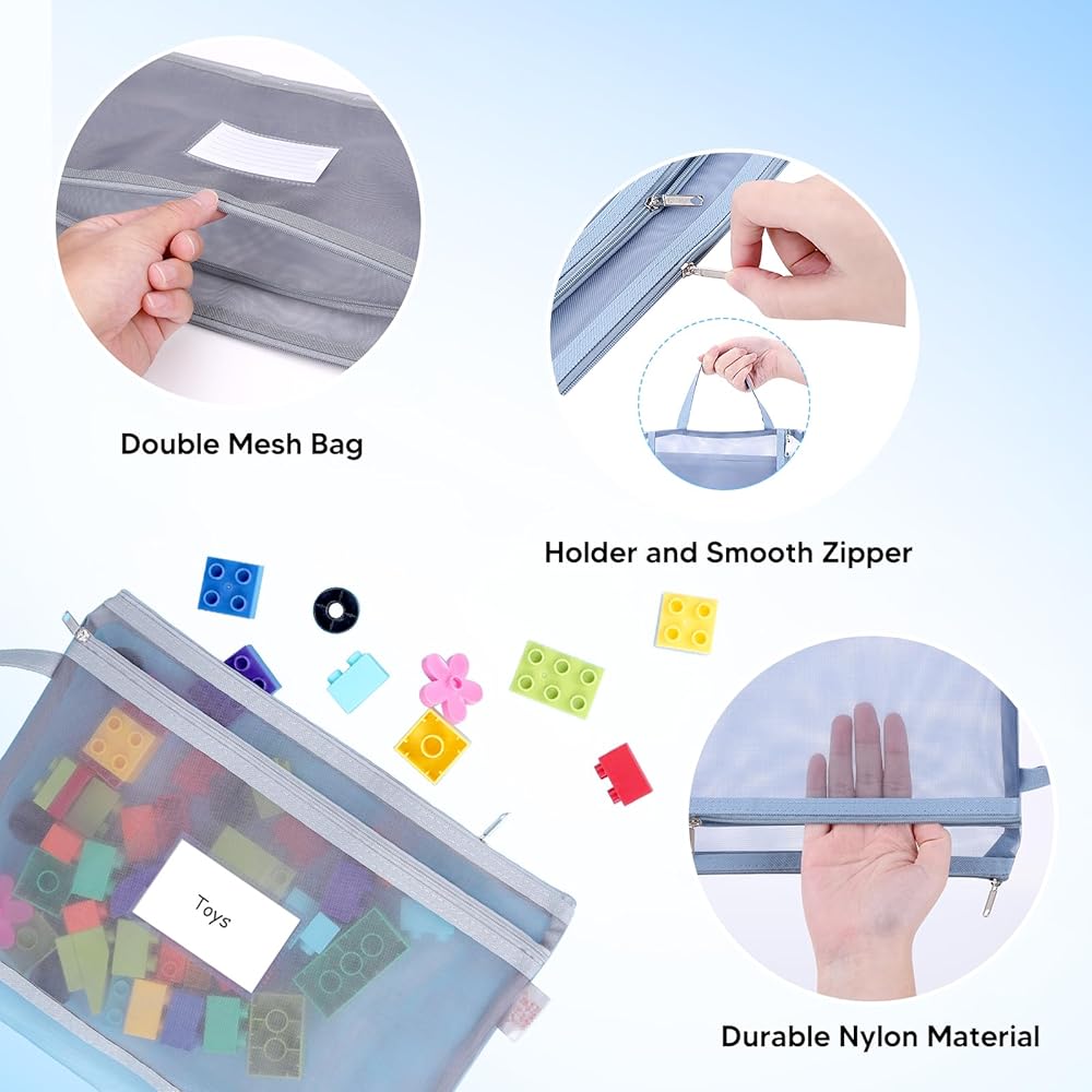 Double-Layer Mesh Zipper Bags --- You will receive 10 pcs zipper mesh bags (5 pcs A5 size, 5 pcs A4 size). Including navy blue, silver grey, beige, brick red and army green, 2 of each color. The breathable mesh zipper bags have double mesh pouches, one for toy manuals and another for toy pieces. It can store toys in a quick and organized way, keeping your home neat and organized.