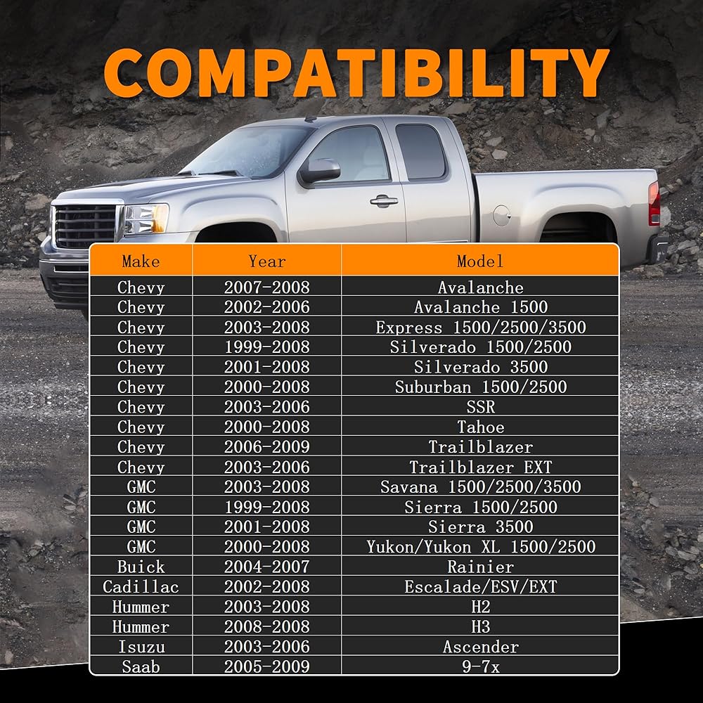 Fitment:for GMC: 2003-2008 Savana 1500/2500/3500, 1999-2008 Sierra 1500/2500, 2001-2008 Sierra 3500, 2000-2008 Yukon/Yukon XL 1500/2500, for Buick Rainier 2004-2007, for Cadillac Escalade/ESV/EXT 2002-2008, for Hummer H2 2003-2008, for Hummer H3 2008-2008, for Isuzu Ascender 2003-2006 ,for Saab 9-7x 2005-2009
