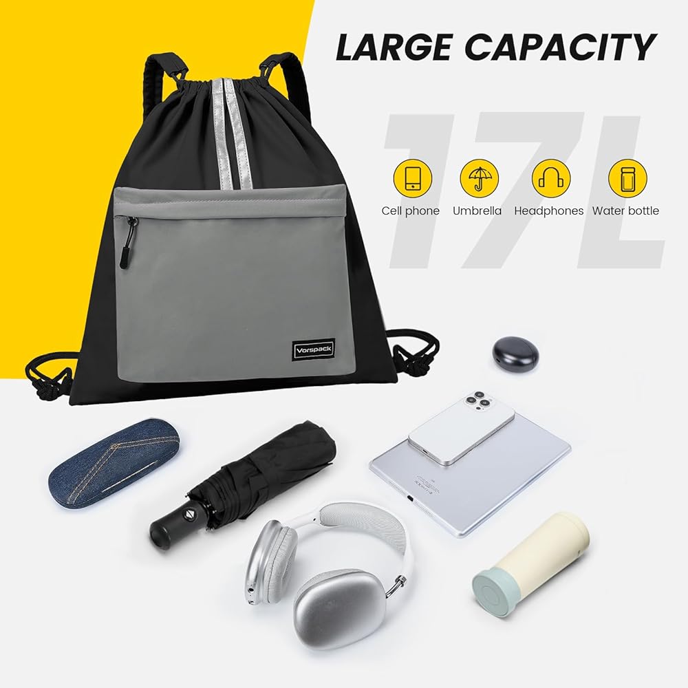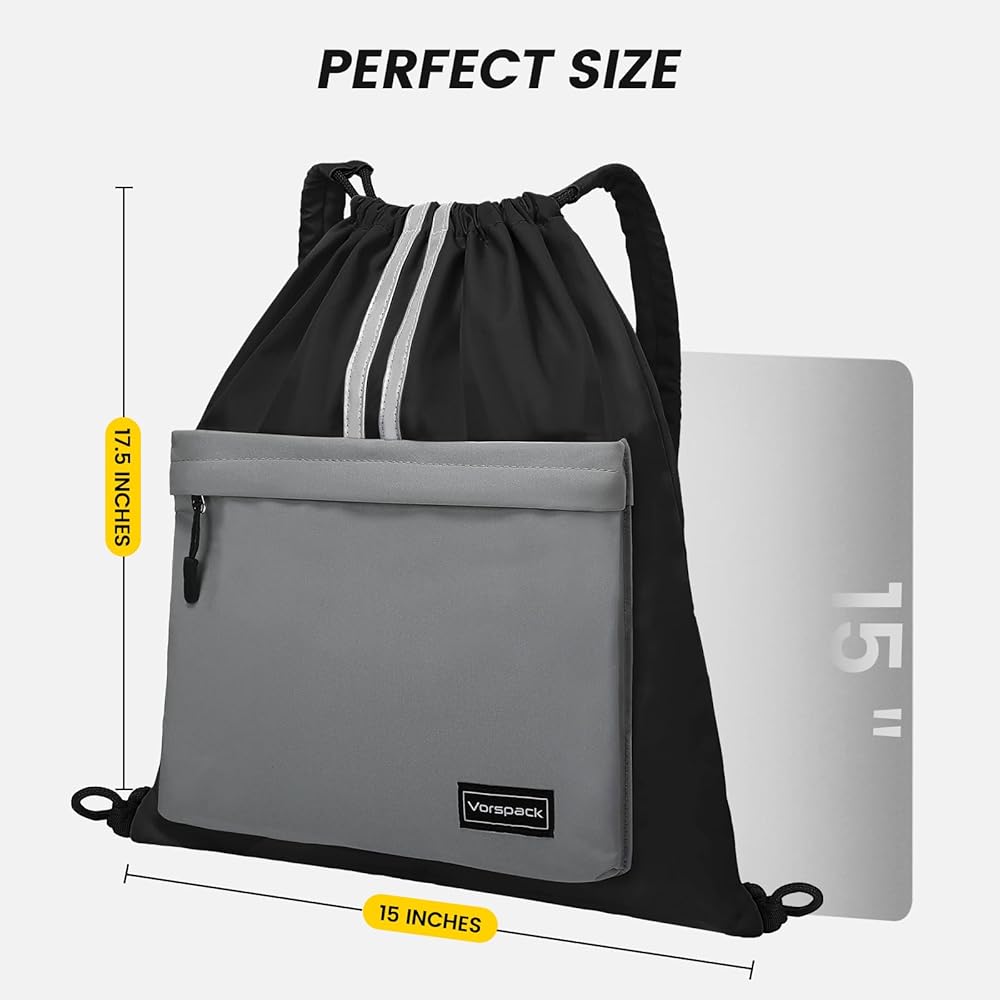 حقيبة ظهر برباط من Vorspack - حقيبة برباط مع جيب أمامي حقيبة ظهر خفيفة الوزن مع أشرطة عاكسة للضوء حقيبة للمشي لمسافات طويلة في صالة الألعاب الرياضية - أسود