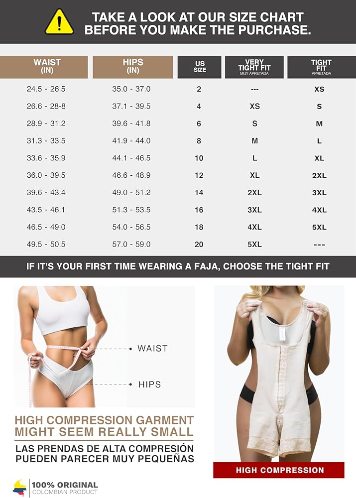 CHECK SIZE CHART BEFORE THE PURCHASE: Fajas' sizes are different from usual clothes, always measure your waist and hips to find your size. Hips measures for BEGINNERS: XS (35-37"), S (37.1-39.5"), M (39.6-41.8"), L (41.9-44"), XL (44.1-46.5"), 2XL (46.6-48.9"), 3XL (49-51.2"), 4XL (51.3-53.5") If you are a regular faja user, find your size in the column EXPERT. It will seem smaller than it really is, STRETCH IT! We have great videos with NOT SO OBVIOUS TIPS (visit our Store to find them).